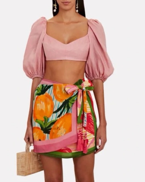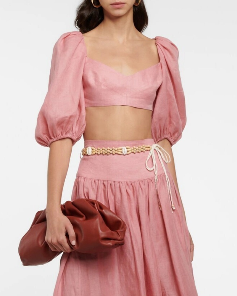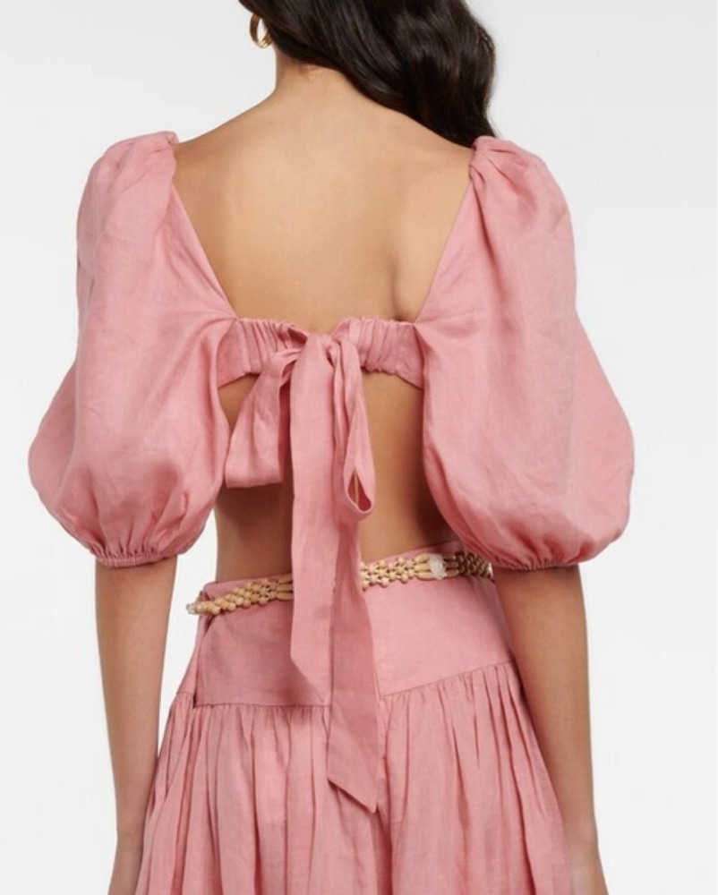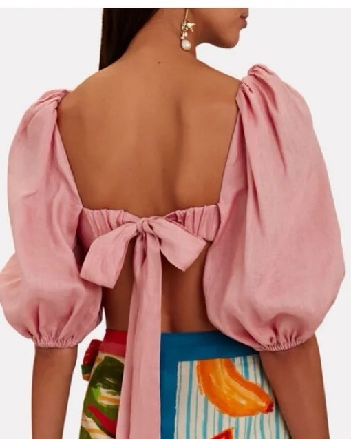 Fun cropped Zimmermann light pink linen crop top with puff sleeves. Perfect for a summer night with a skirt or pants! Zimmermann size 3 (US Large / 10/12). Will fit a D cup and above