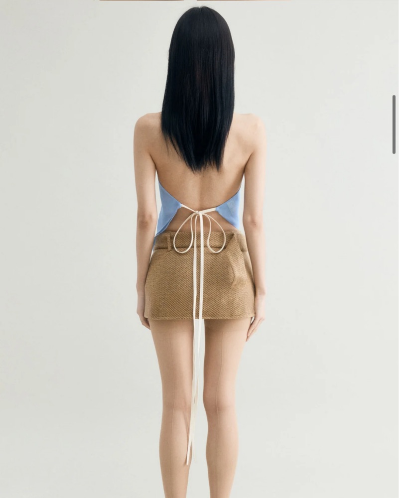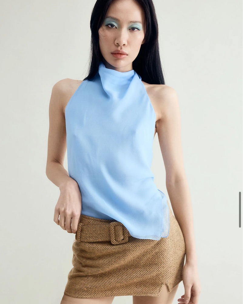 Blue high neck tie back top