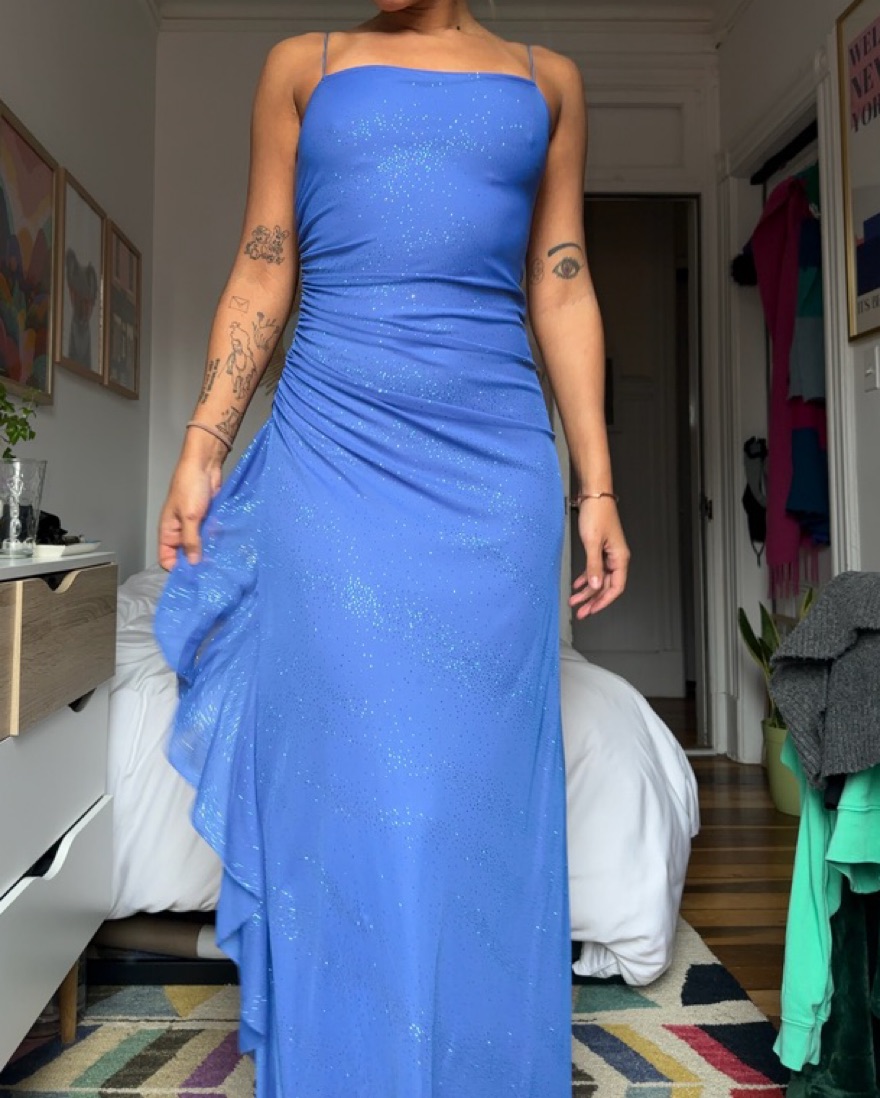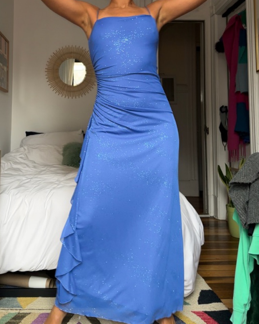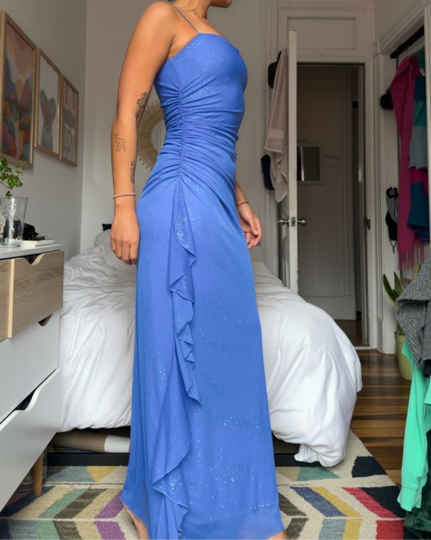 Vintage periwinkle blue spaghetti strap prom dress with a scrunched side sparkling ruffle overlay detail