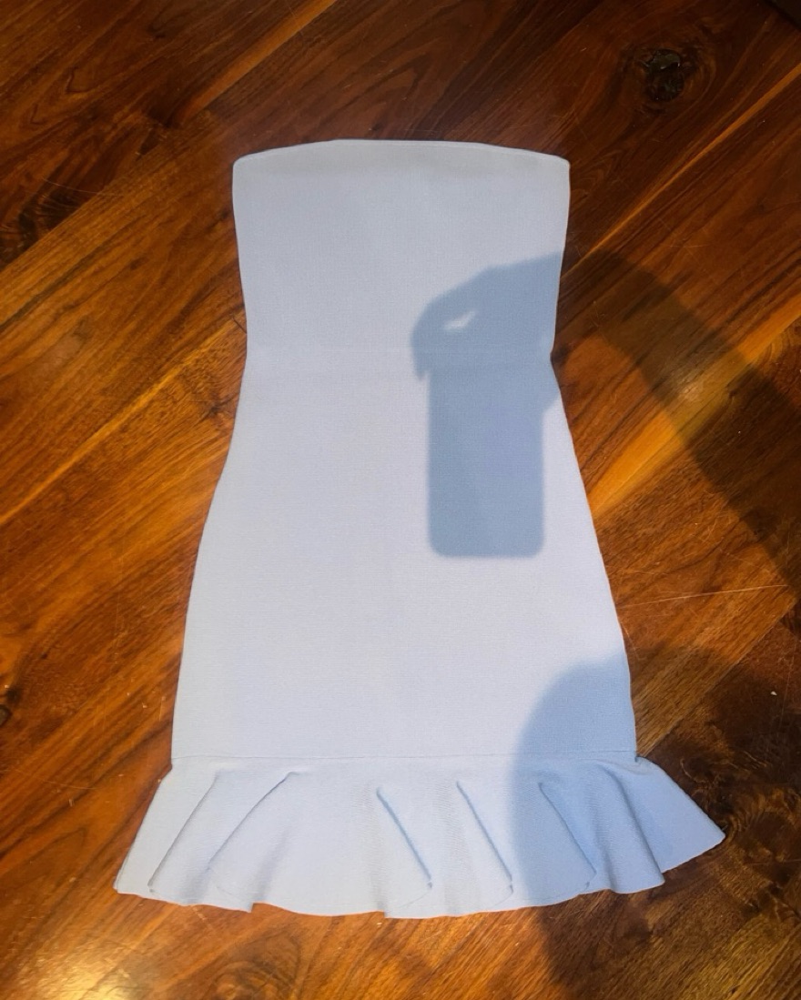 Blue strapless mini dress with ruffled bottom.