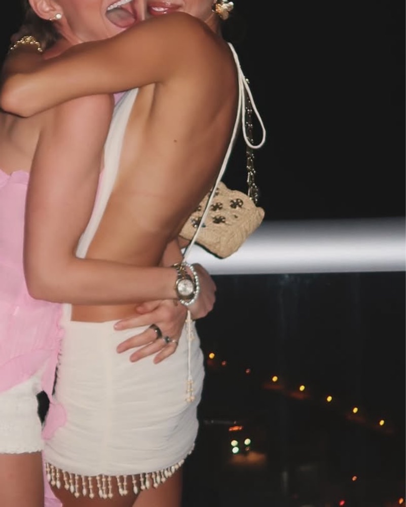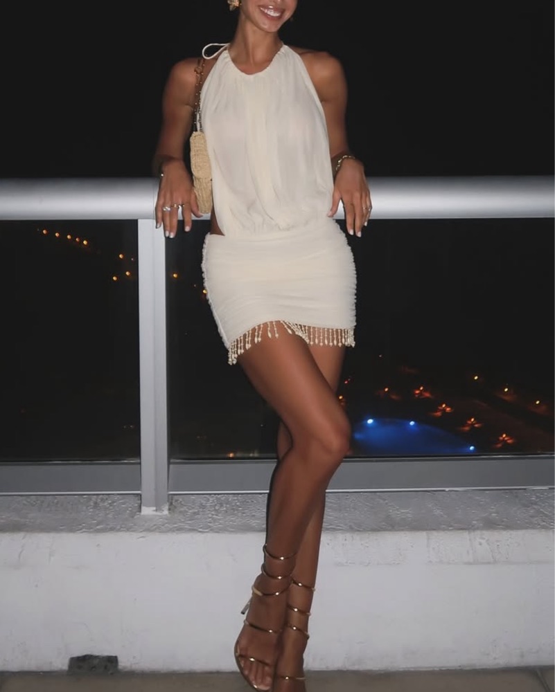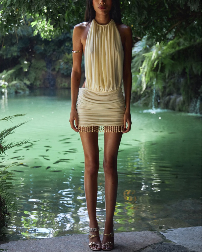 Butter Yellow. A draped, ruched, semi sheer mini dress with adjustable front panels, open back, ties at the back of the neck and hand beaded along the hem. Ties can be worn across the neck like a halter or across the back to be worn strapless.
