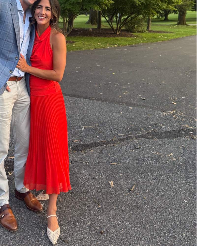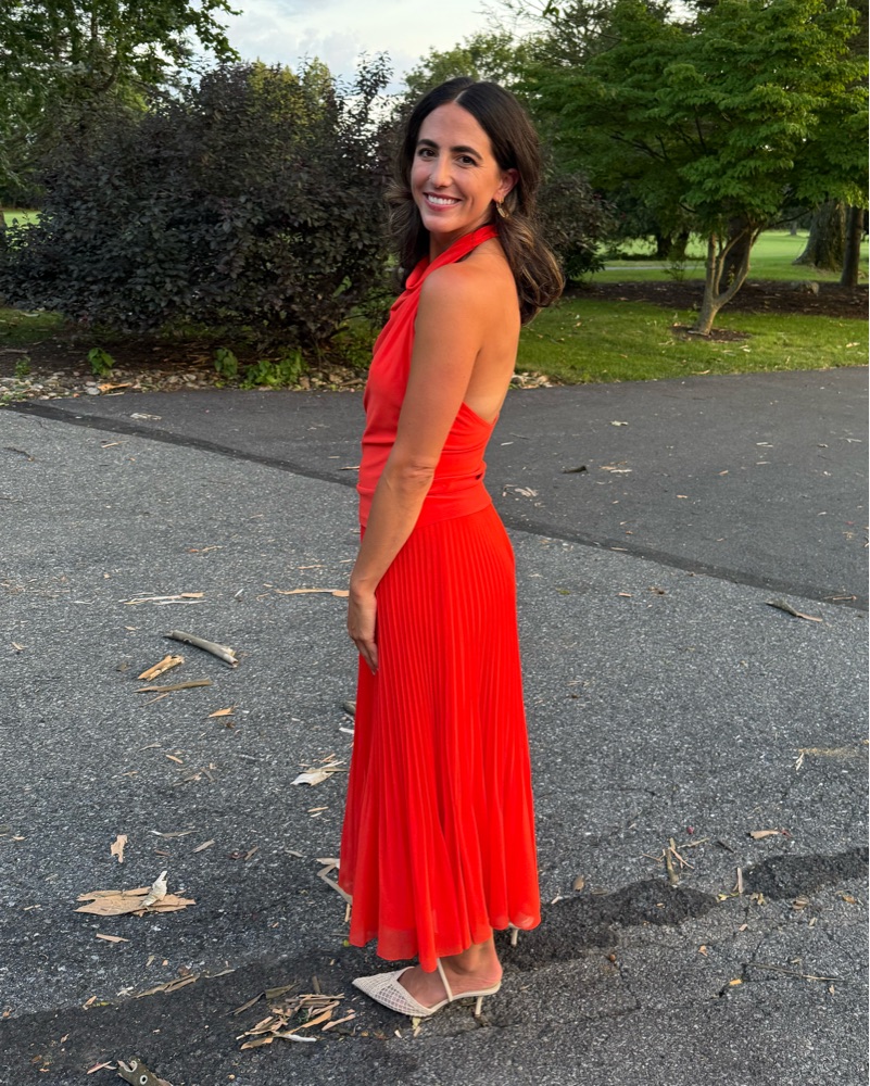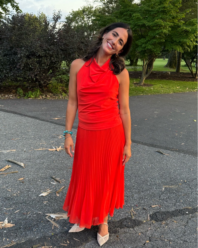 Brand new red/orange/coral set from Aritzia. Only wore once to a rehearsal dinner. Lots of compliments. *Note Skirt is XS (skirt is true to size) and top is L (top runs very small and looks better a little oversized imo).