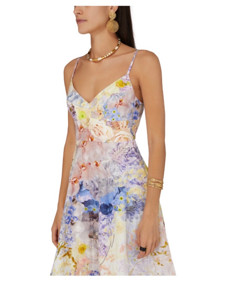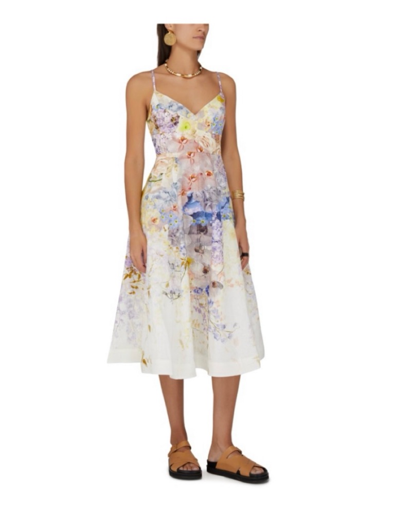 Sweetheart neckline, adjustable straps, highlighted waist, side pockets, back zip. Box pleat details. Zimmermann 0