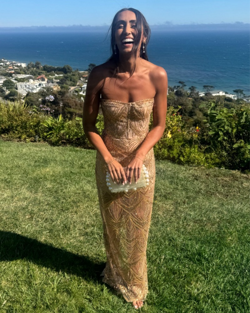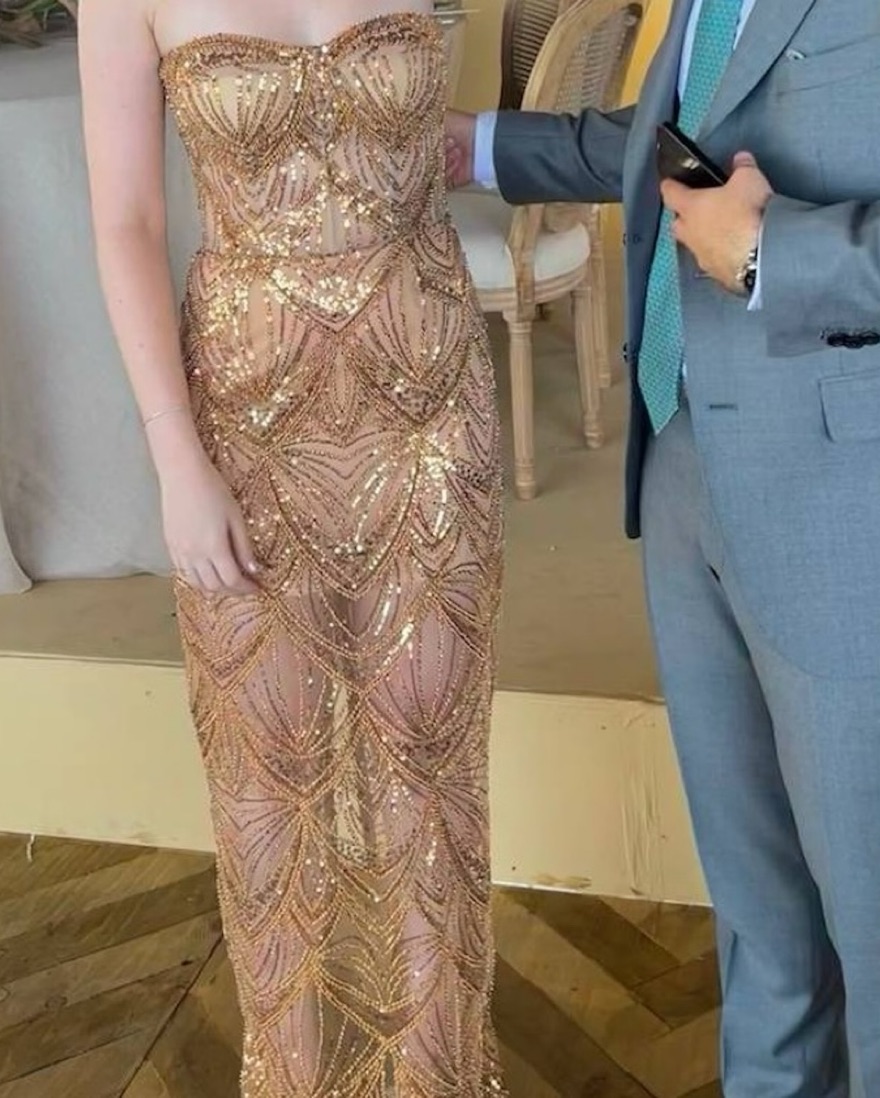 Please handle her with care!💘 color is gold. Size xS/S. So stunning on, Perfect for formal events, wedding guests, etc. Retails at $895, 100% polyester, dry clean only please! Boned bodice, embellishments throughout
