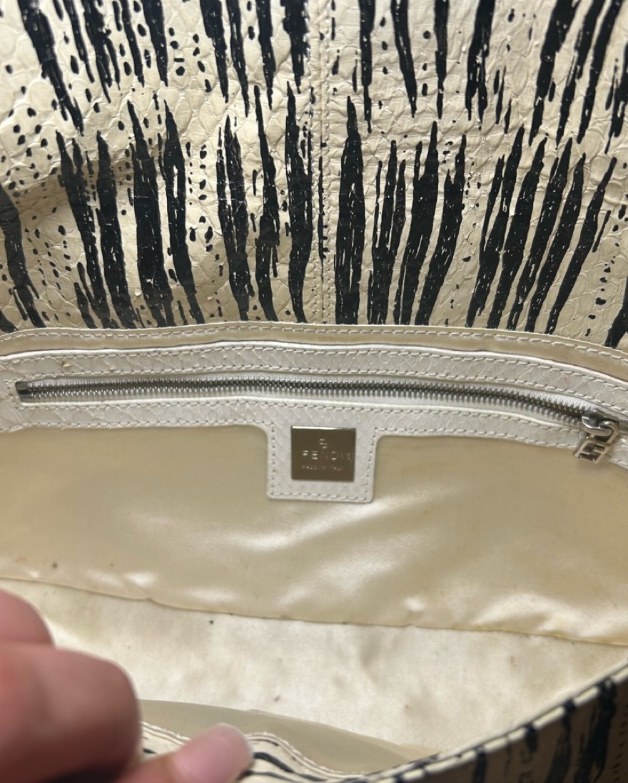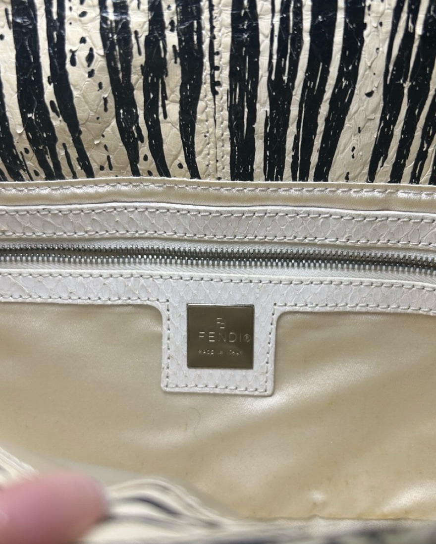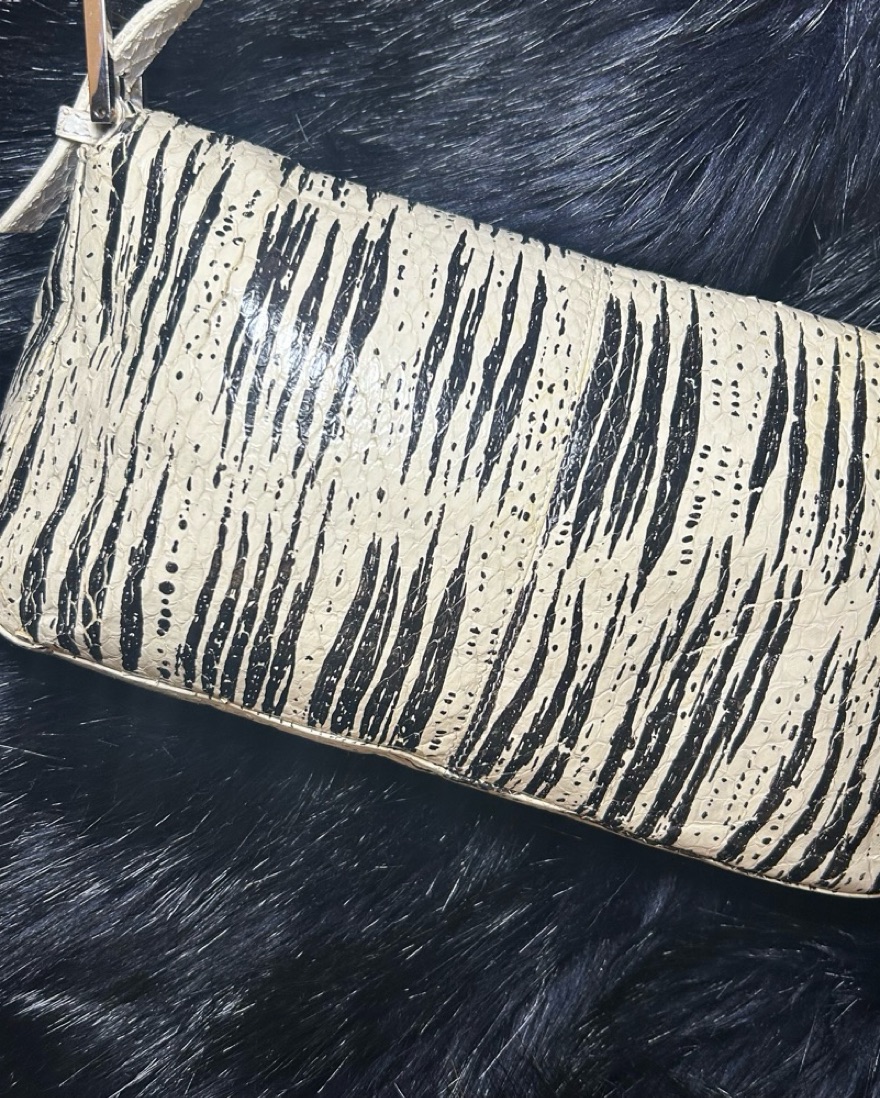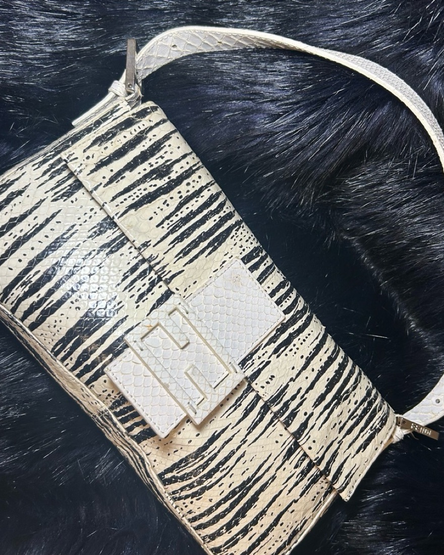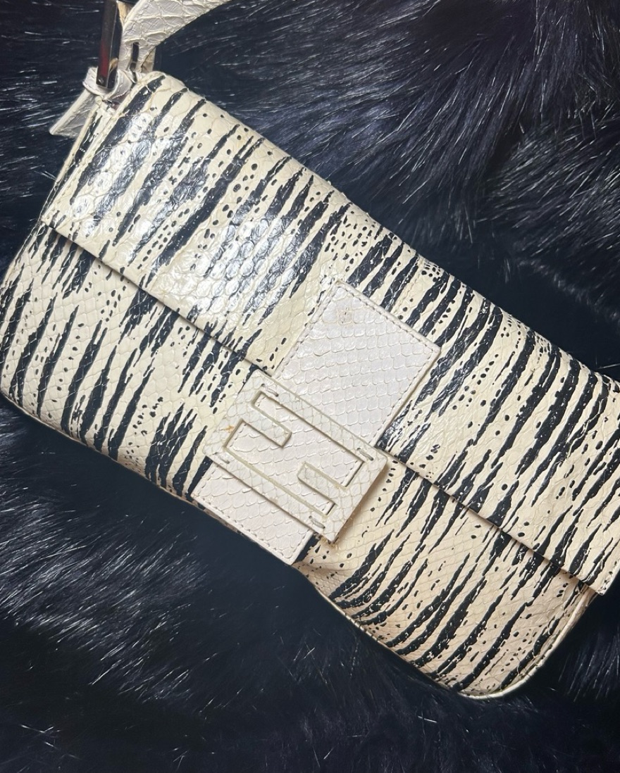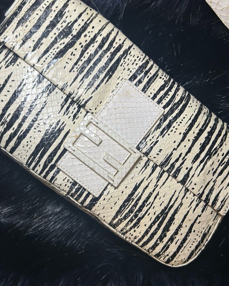 Fendi Baguette shoulder bag, likely the Pre-Owned Animal Print or Python Snakeskin version. The bag, designed by Silvia Venturini Fendi in 1997, gained popularity after being featured in "Sex and the City".
