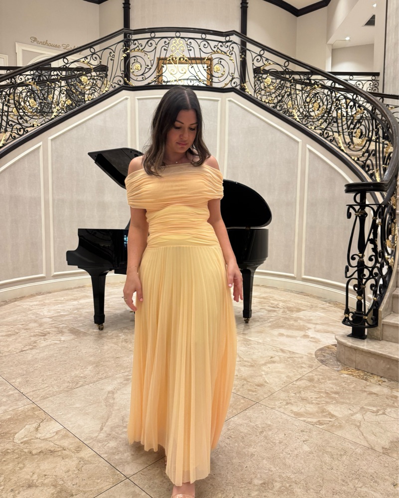 Flattering and comfortable butter yellow dress. Perfect for weddings.