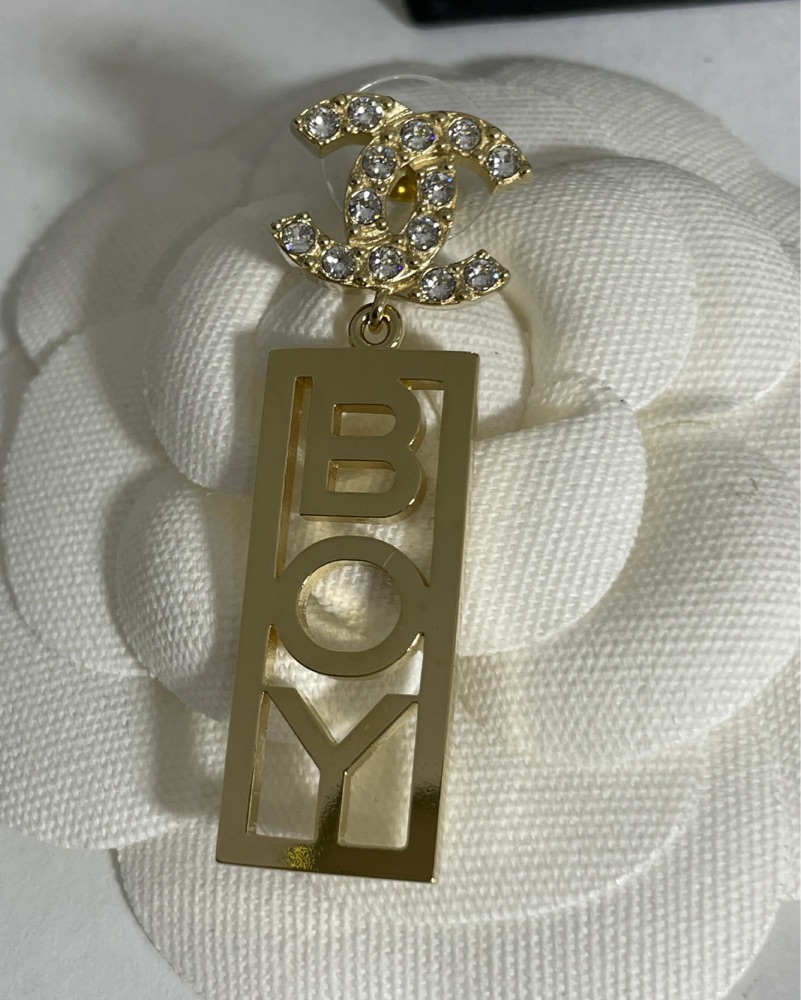 This is an authentic pair of CHANEL Metal Crystal CC Boy Drop Earrings in Gold. These stunning earrings feature a gold drop that says "BOY" with a Chanel CC encrusted with crystals.