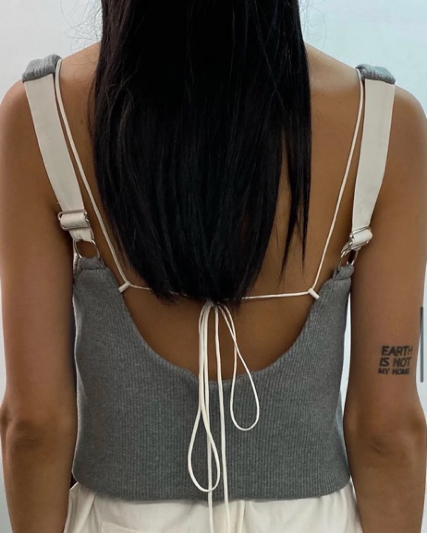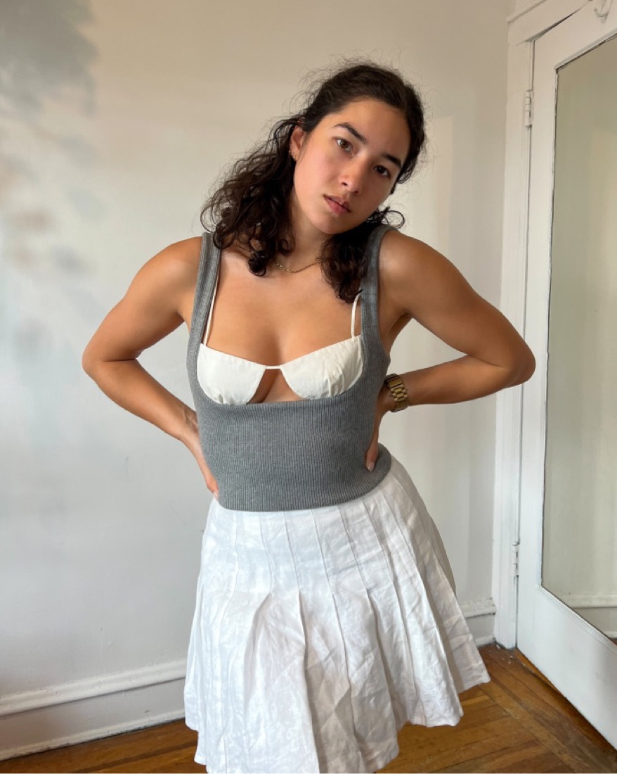 Heather grey knit top with contrast exposed “bra” in white. Ties in the back. Straps are adjustable. Can cover up to a DD/F cup bust if band size is 30-34