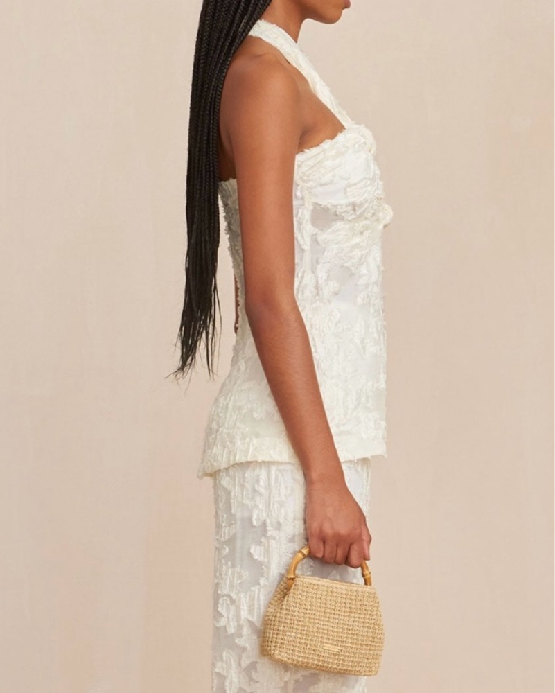 Cult Gaia ivory/off white halter top with a textured fabric, has a flowy A-line fit. Mint condition, haven’t had the opportunity to wear it yet! Super cute for beachy vacations 🌞