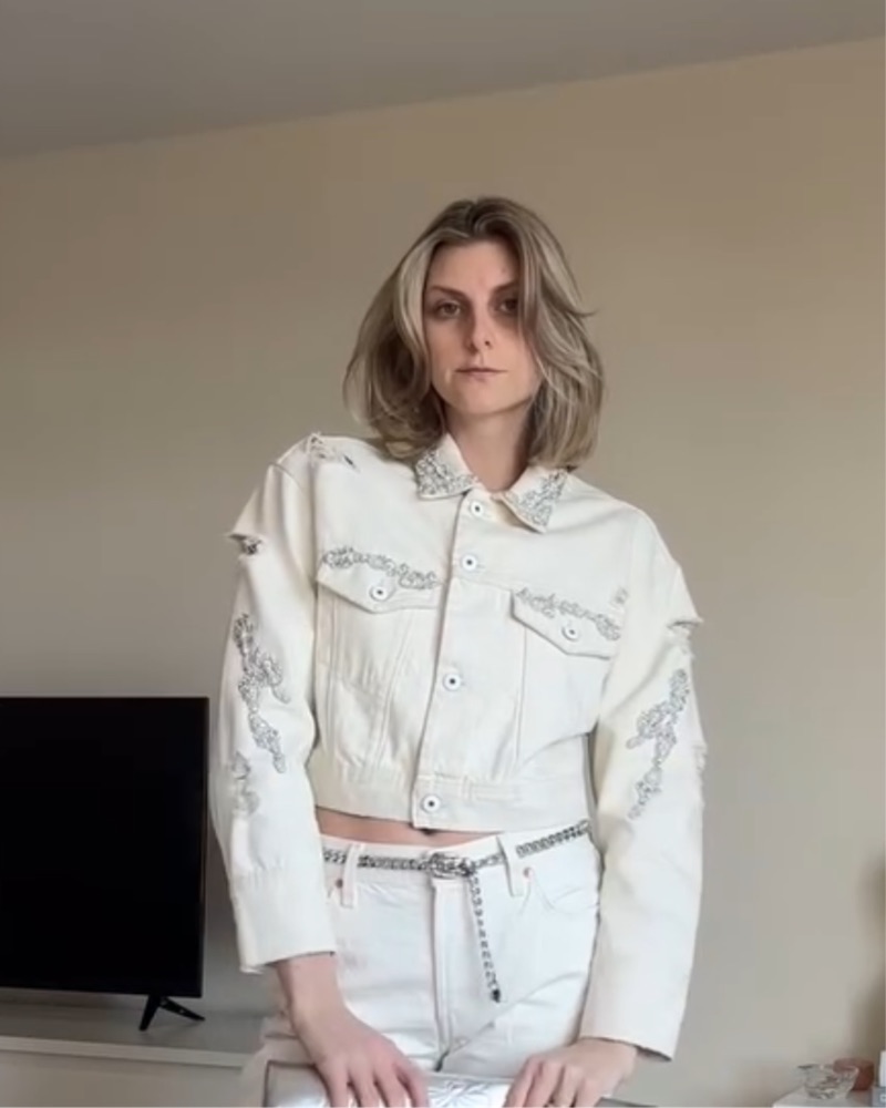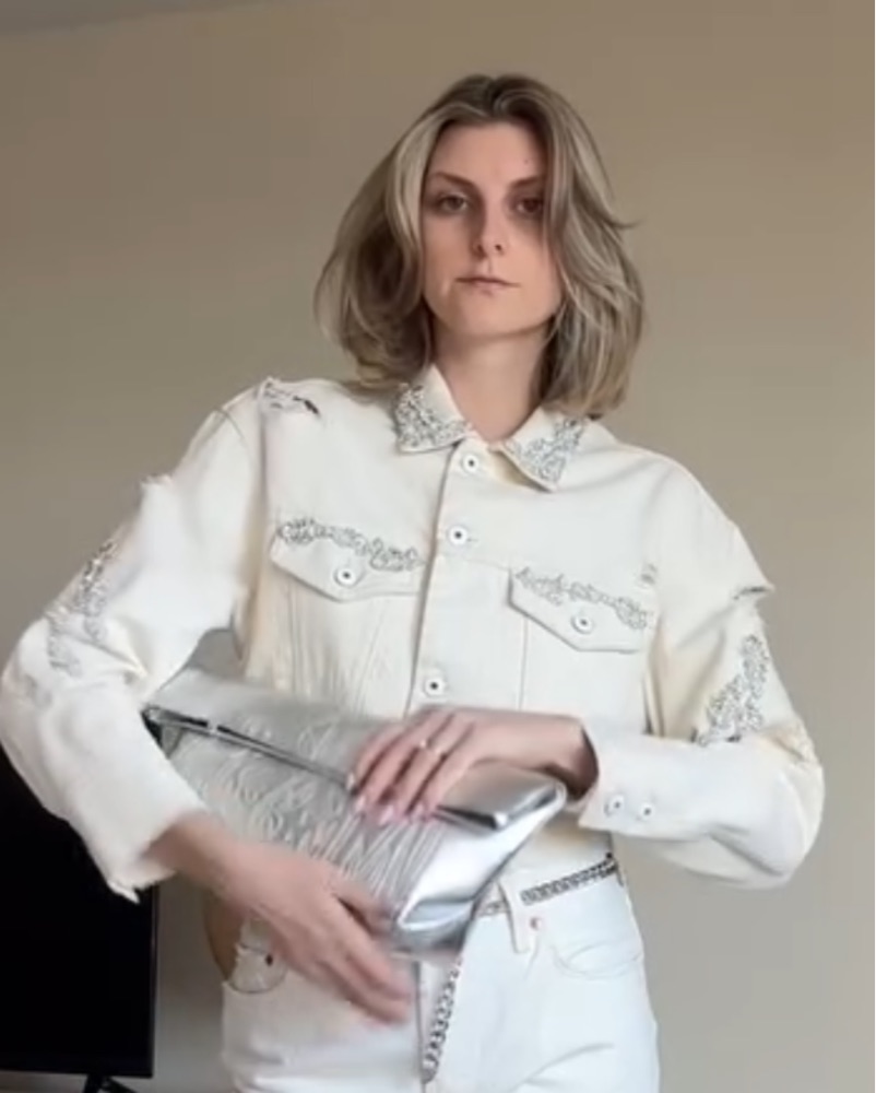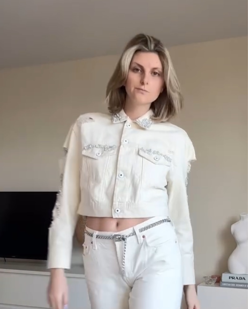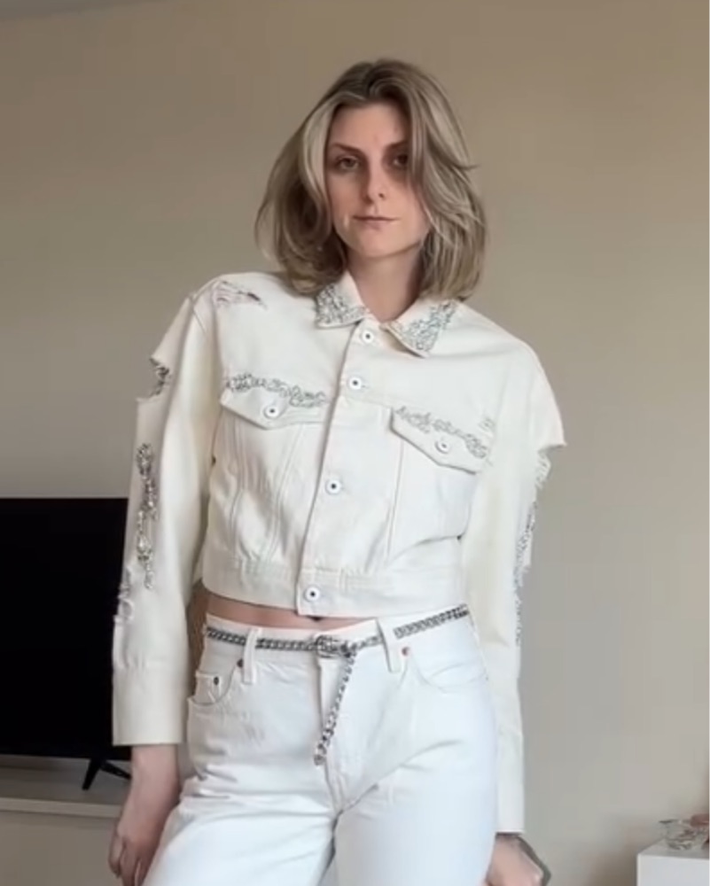 Jonathan Simkhai ivory, crystal-studded denim jacket with embroidered detailing. Great for bridal events or a casual outing