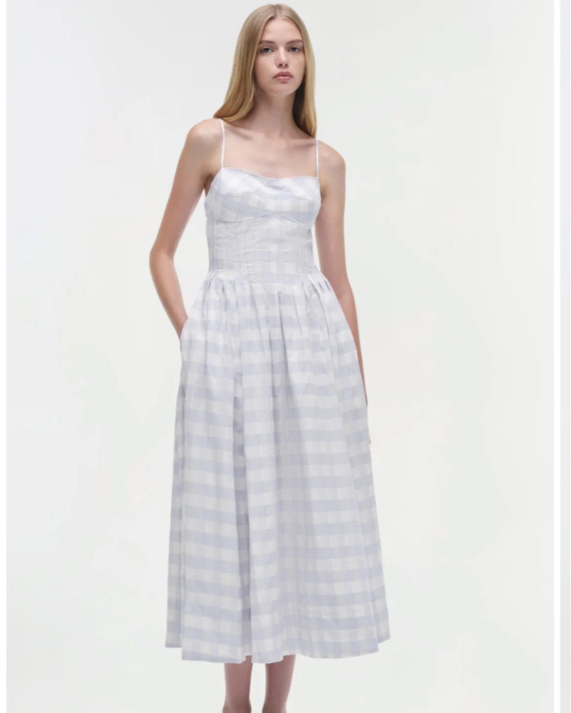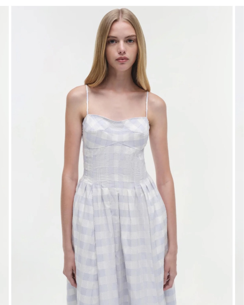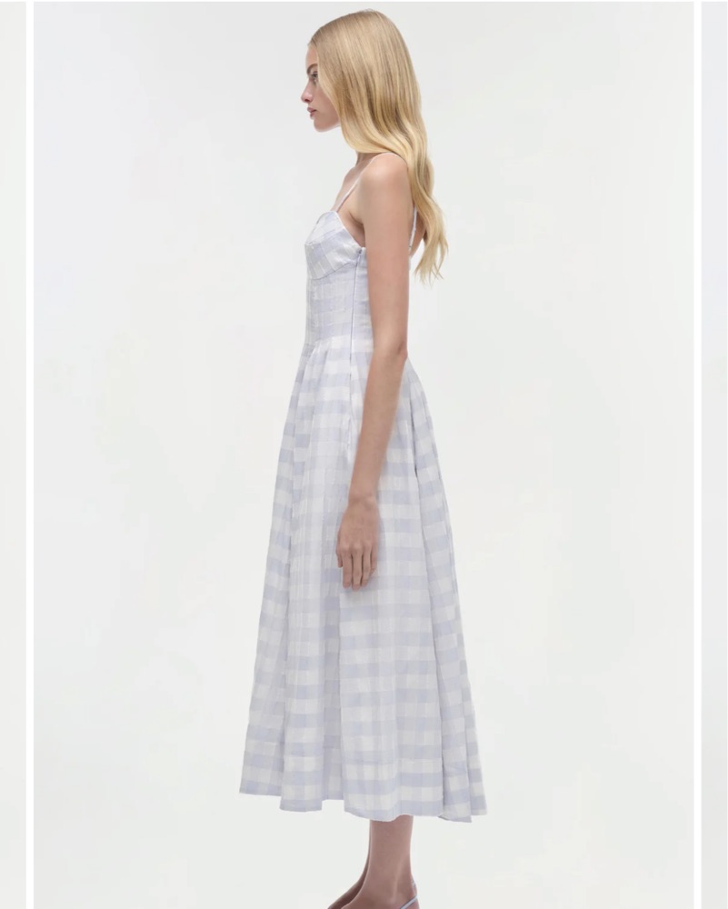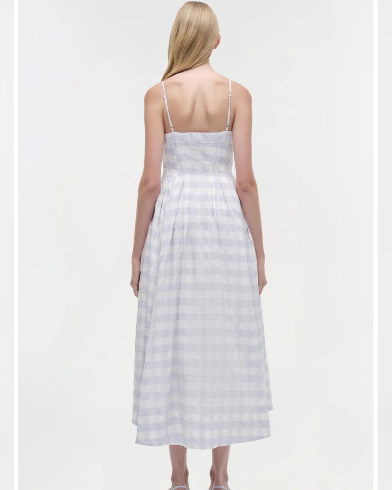 The Kittiya Cotton Midi Dress in Periwinkle Sky Multi. Crafted in gingham cotton fil coupe combo, this midi features a fitted bodice and a flowing skirt. The intricate fabric adds texture and dimension to this elegant silhouette.