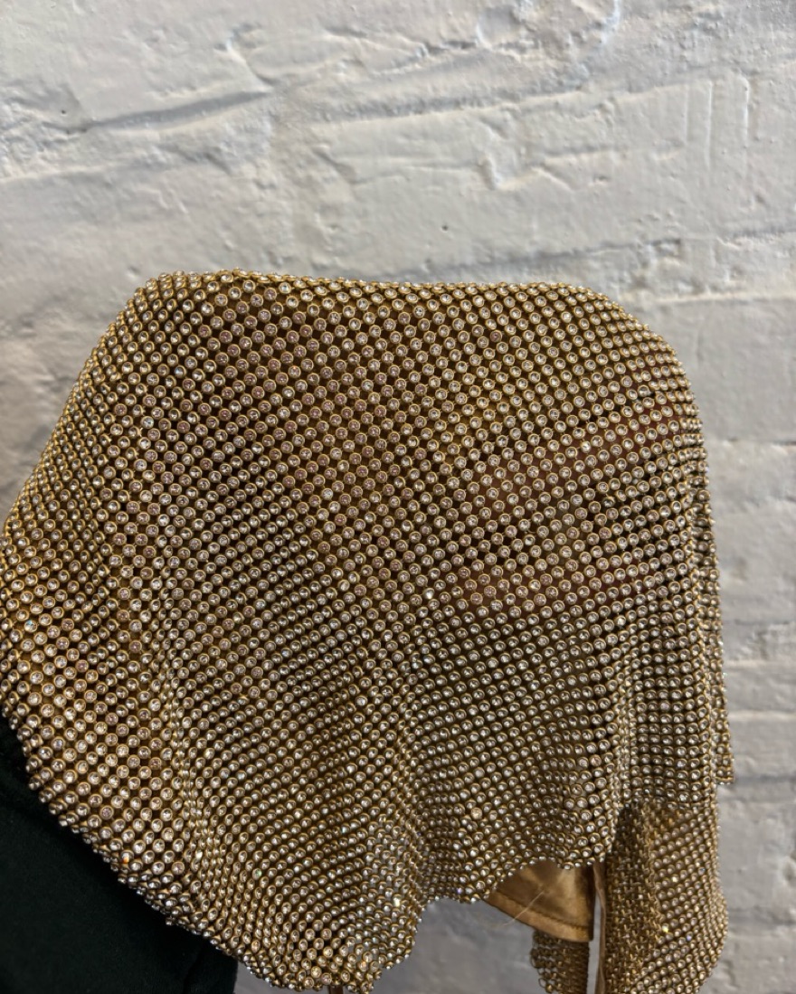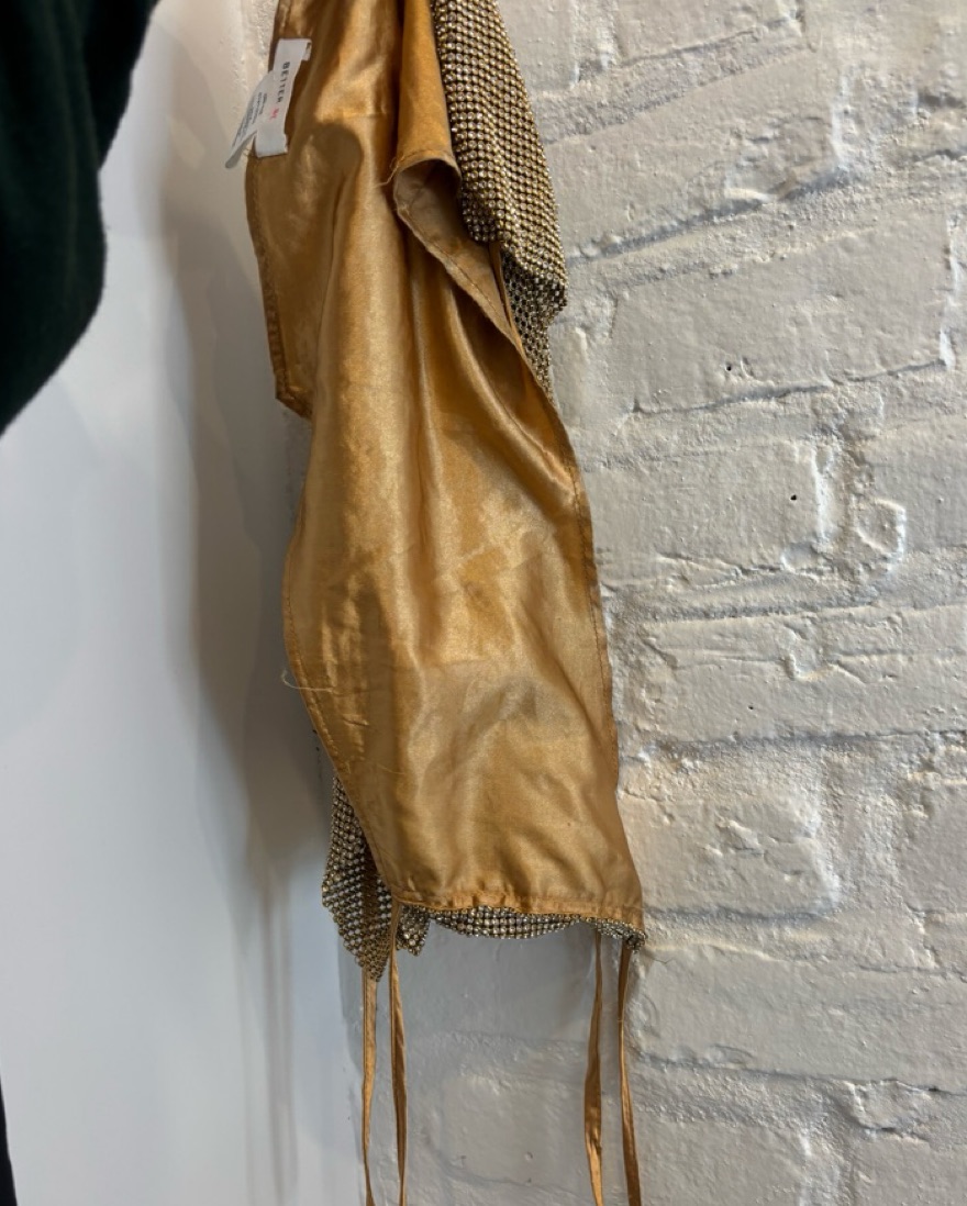 Gold rhinestone and metal material top that is lined with a silky material and ties around the neck and back. Open back concept and is not see through due to the lining. This top is perfect for a bday/ new years/ red carpet party and photographs so well! Size S but accommodating with the ties
