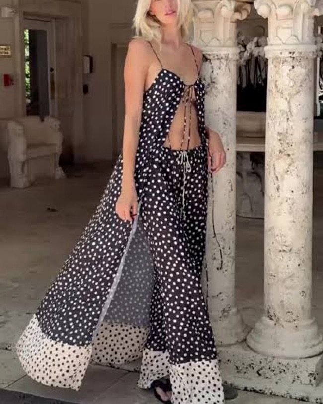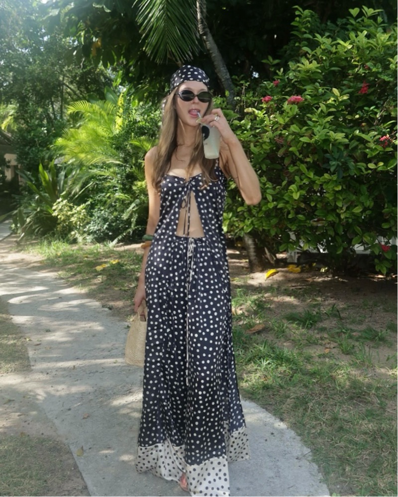 Pants, dress/top, and scarf. Scarf can we worn as a top, sarong, or headscarf. Navy/white polka dot pattern. Pants and dress/top are size S. Total retail value $820