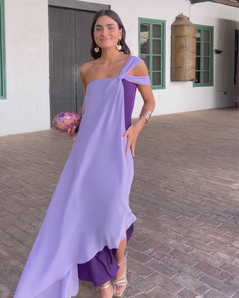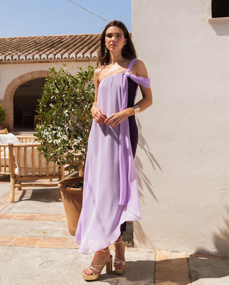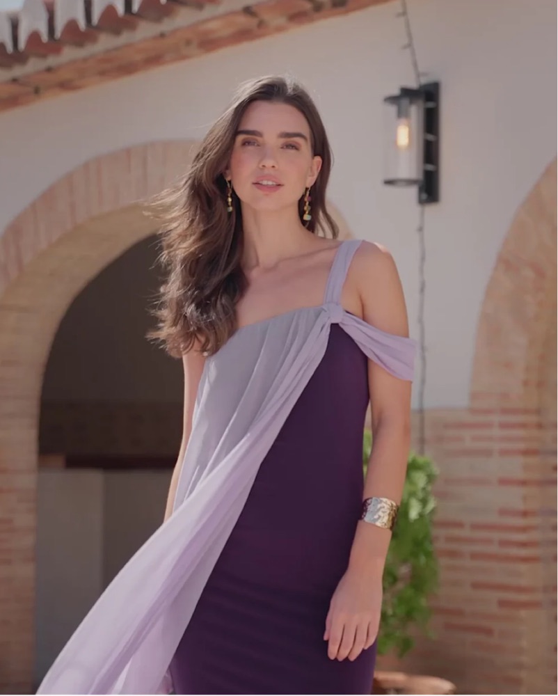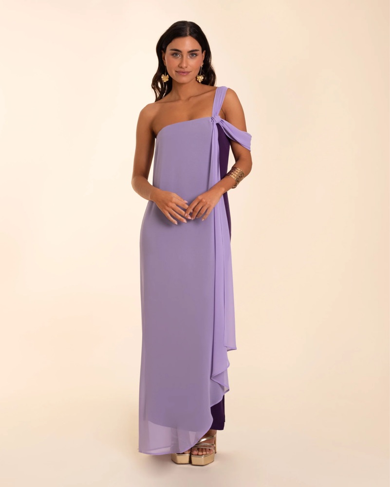 Composed of a long purple strapless dress and a lilac chiffon cape that contrasts perfectly and provides movement. The combination of colors makes it a perfect dress for day and night -Double chiffon fabric.