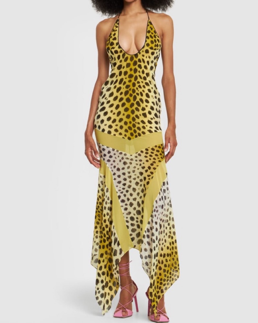 One of my favorite dresses ever - please wear with care. Size IT 40/US 4. Can fit 2/4. Straps can be worn 2 ways. halterneck, sleeveless, open back, flared asymmetric hem tags: animal print, viral, vintage, leopard print. Length 50in. cheetah, jungle, tequila sunrise dress