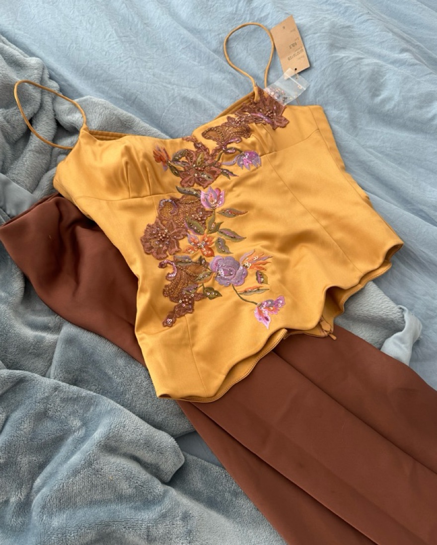 Besutifully embroidered vintage orange Mandalay designs corset asymmetrical top.