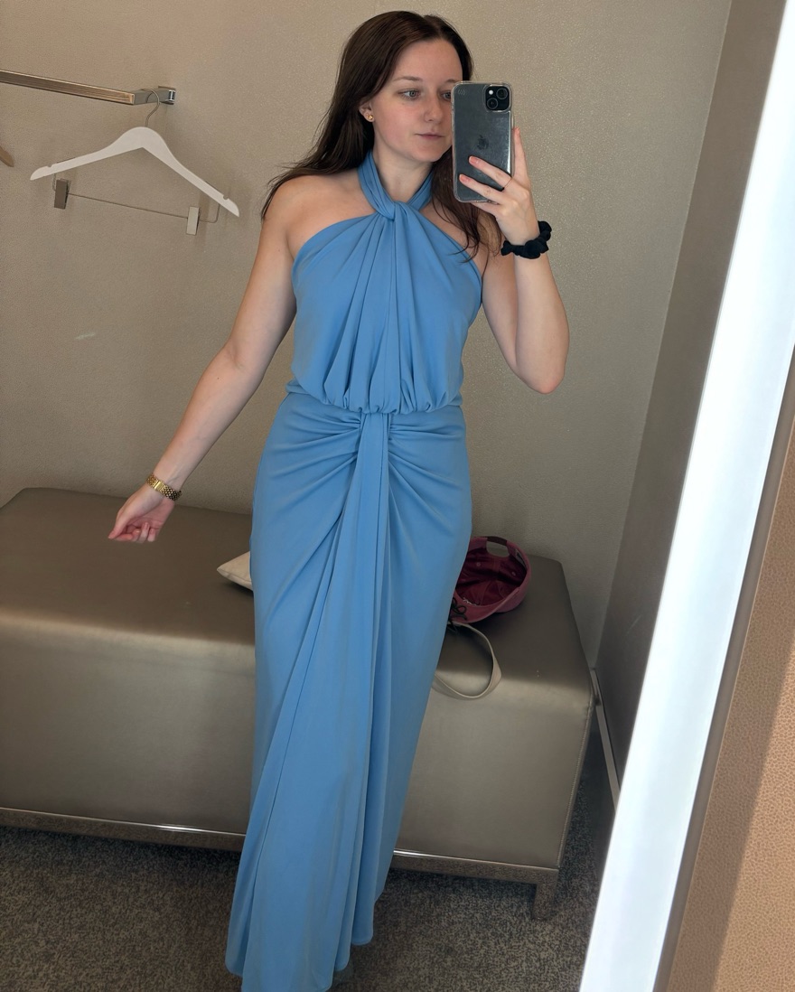 Beautiful light blue floor-length dress, perfect to wear to a summer, fall, or spring wedding.