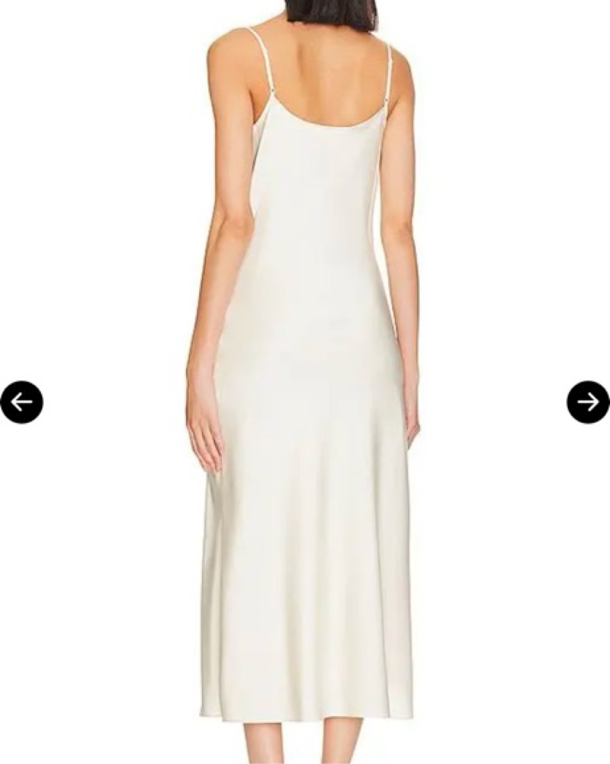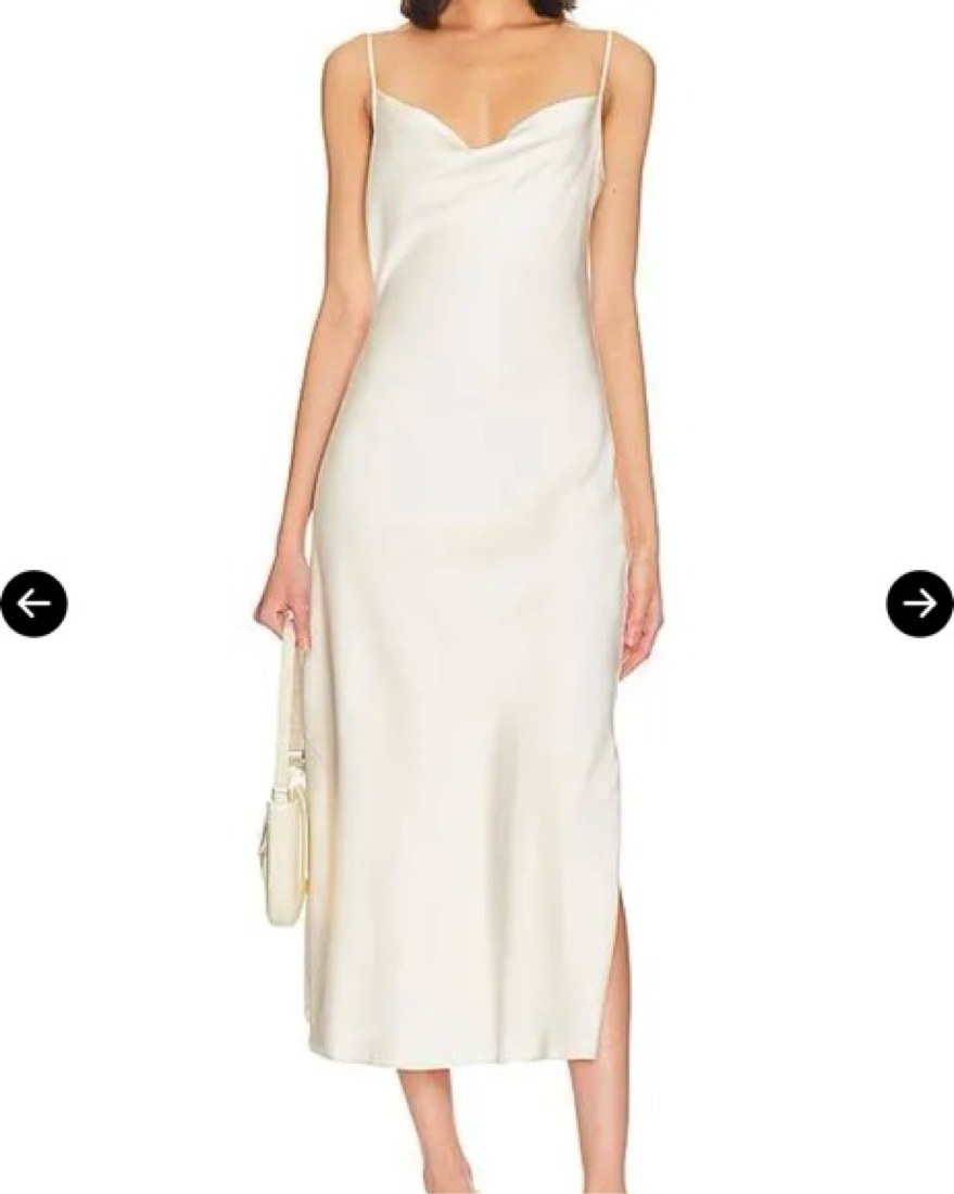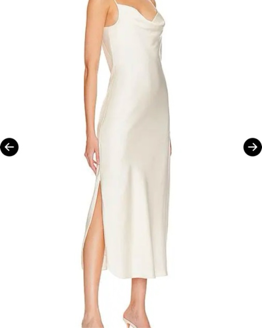 Beautiful ivory “arctic white” satin dress from AllSaints. Perfect for brides or a night out. Fully lined. Pull-on styling. Adjustable shoulder straps. Draped neckline Matte satin fabric with side seam slit