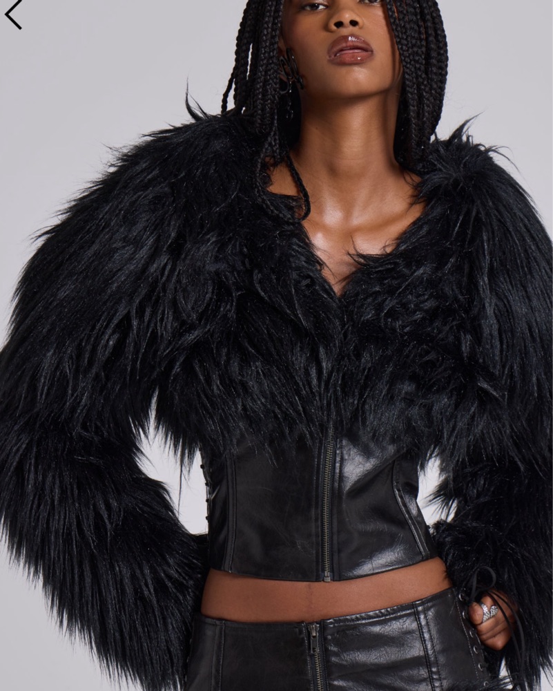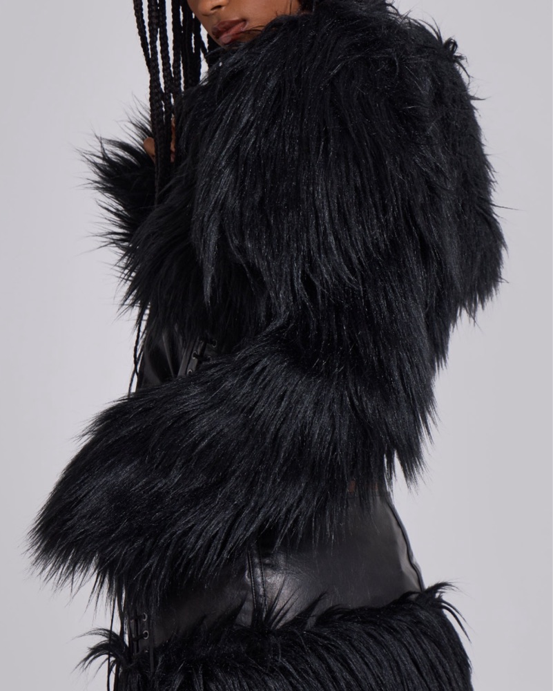 This dramatic black faux fur jacket with feathered accents is the perfect addition to any edgy, high-fashion look. Pair it with leather pants and ankle boots for a chic night out.