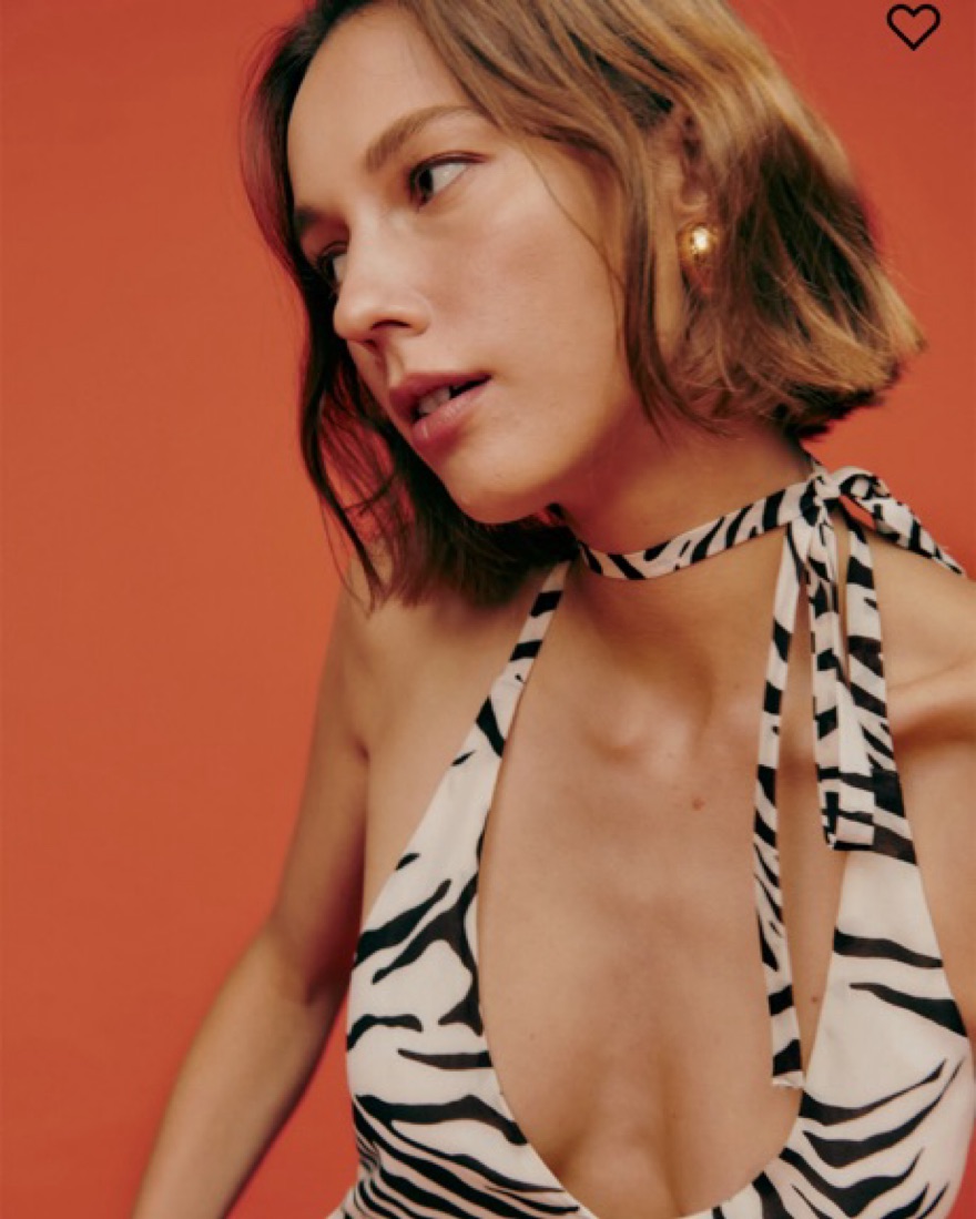 This eye-catching zebra print dress is perfect for a stylish night out. The halter neckline and open back create a flattering, modern look. Sold out on website !