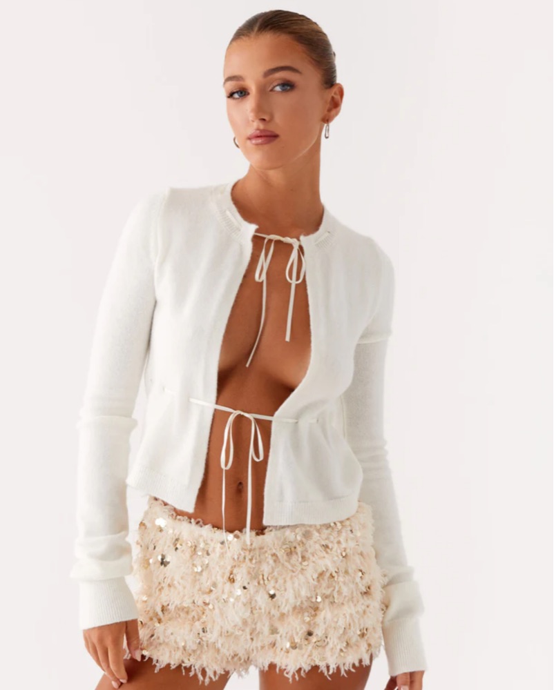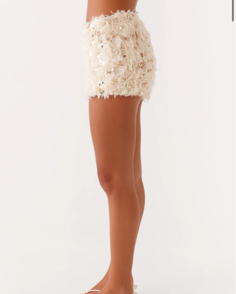 Elevate your style with this chic and playful shorts. The fluffy feather trim adds a touch of glamour to the sleek knit design, making it perfect for a night out or a special occasion.