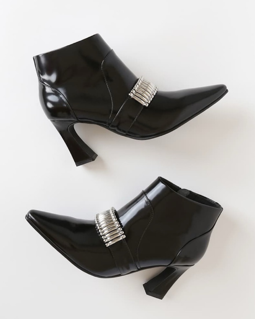 Elevate any outfit with these striking patent leather ankle boots featuring an eye-catching crystal embellishment.