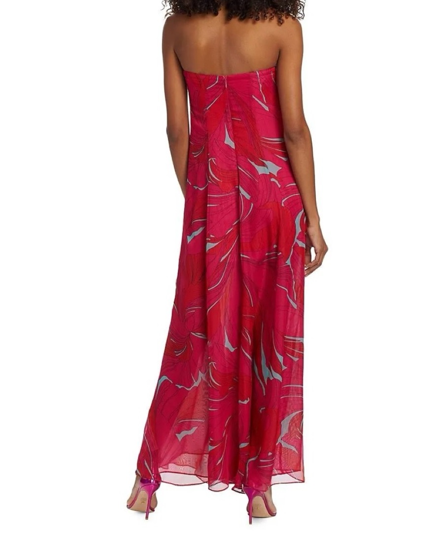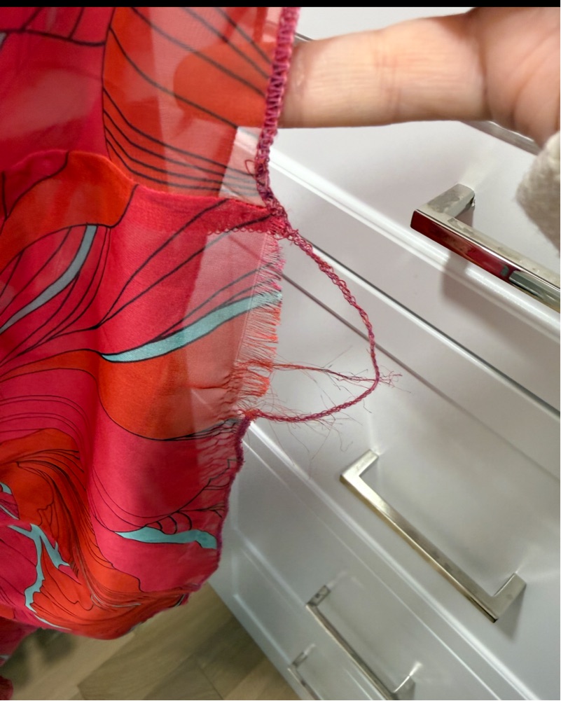 Gorgeous dress! Has a small pull in the middle and bottom of the dresss from getting caught on my shoe :( Beautiful color, very comfortable and lightweight, perfect for a summer wedding! I had the dress shortened. I am 5’4 for reference and wearing 4 inch platforms in the picture.