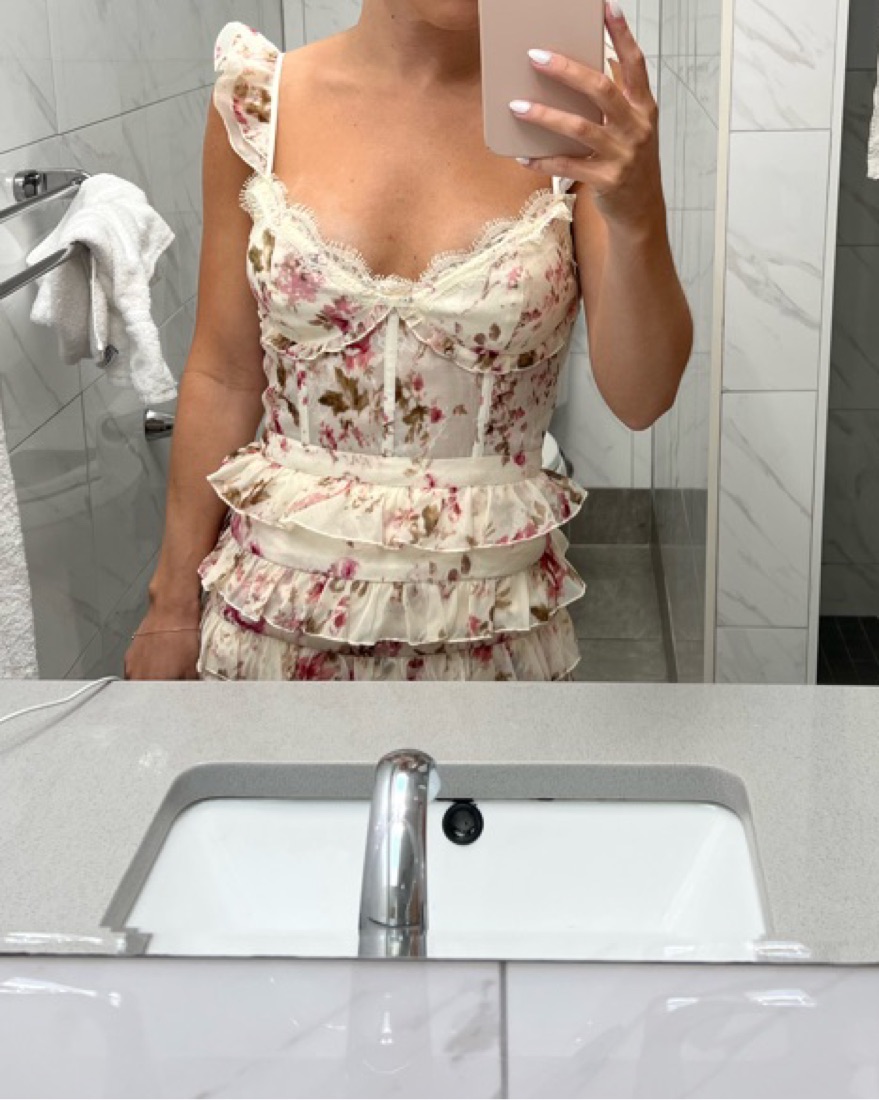 In english rose - this has been hemmed a few inches because I’m 5’3 :) wore for my rehearsal dinner and on honeymoon - its my favorite dress!