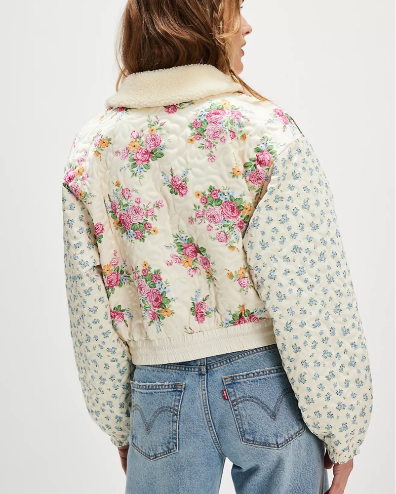 Everything femme in one cozy piece: This cropped puffer jacket from For Love & Lemons features contrasting floral patterns made from a soft quilted fabrication, complete with a sherpa collar for an extra toasty touch.