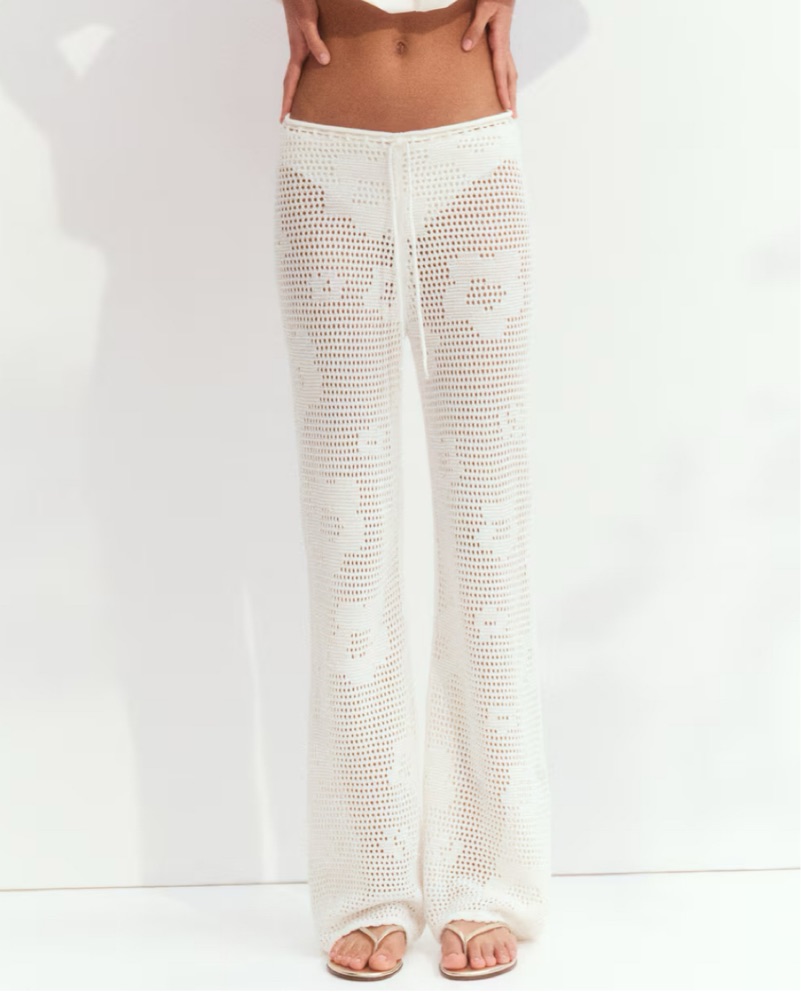White crochet flower detail pants with drawstring. Low rise. Runs a little big but can definitely adjust the waist with the drawstrings! Soft and comfy