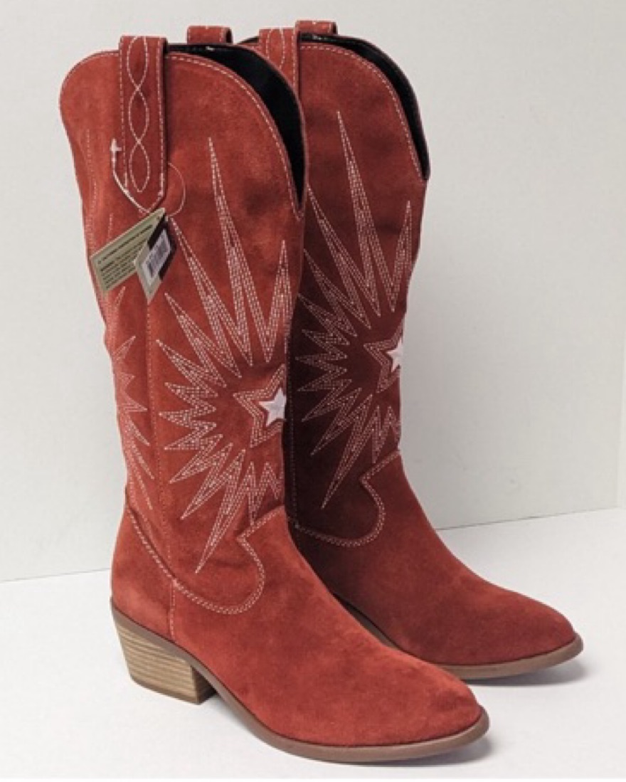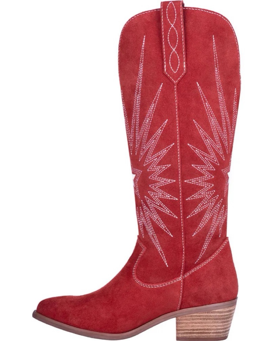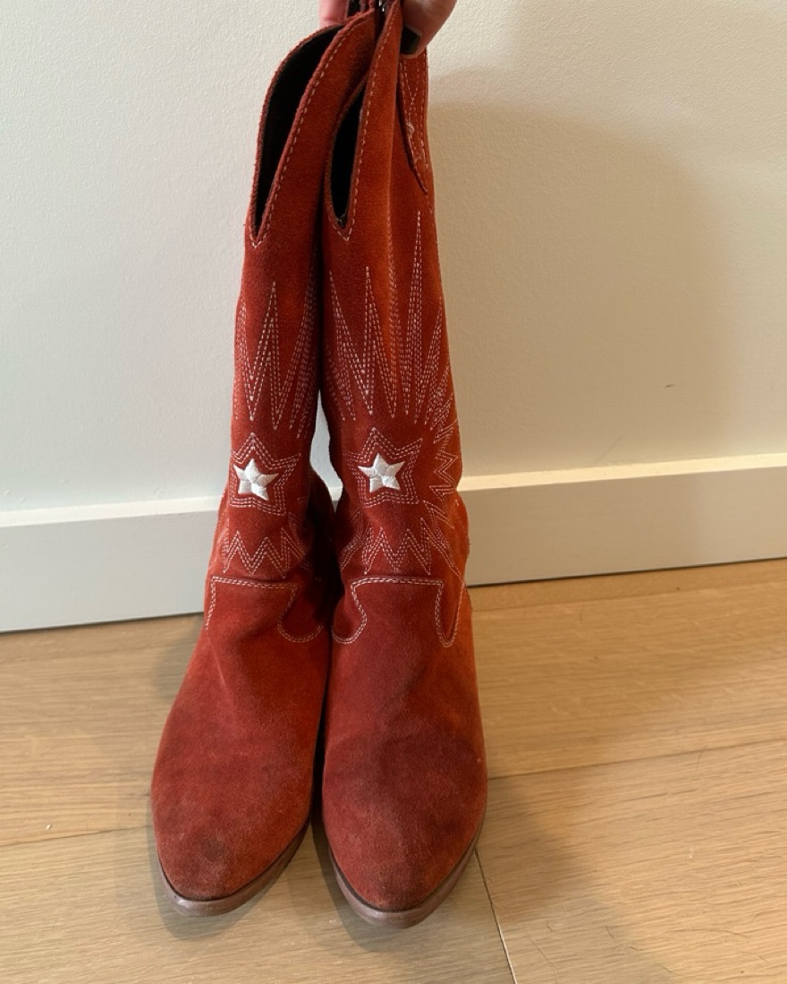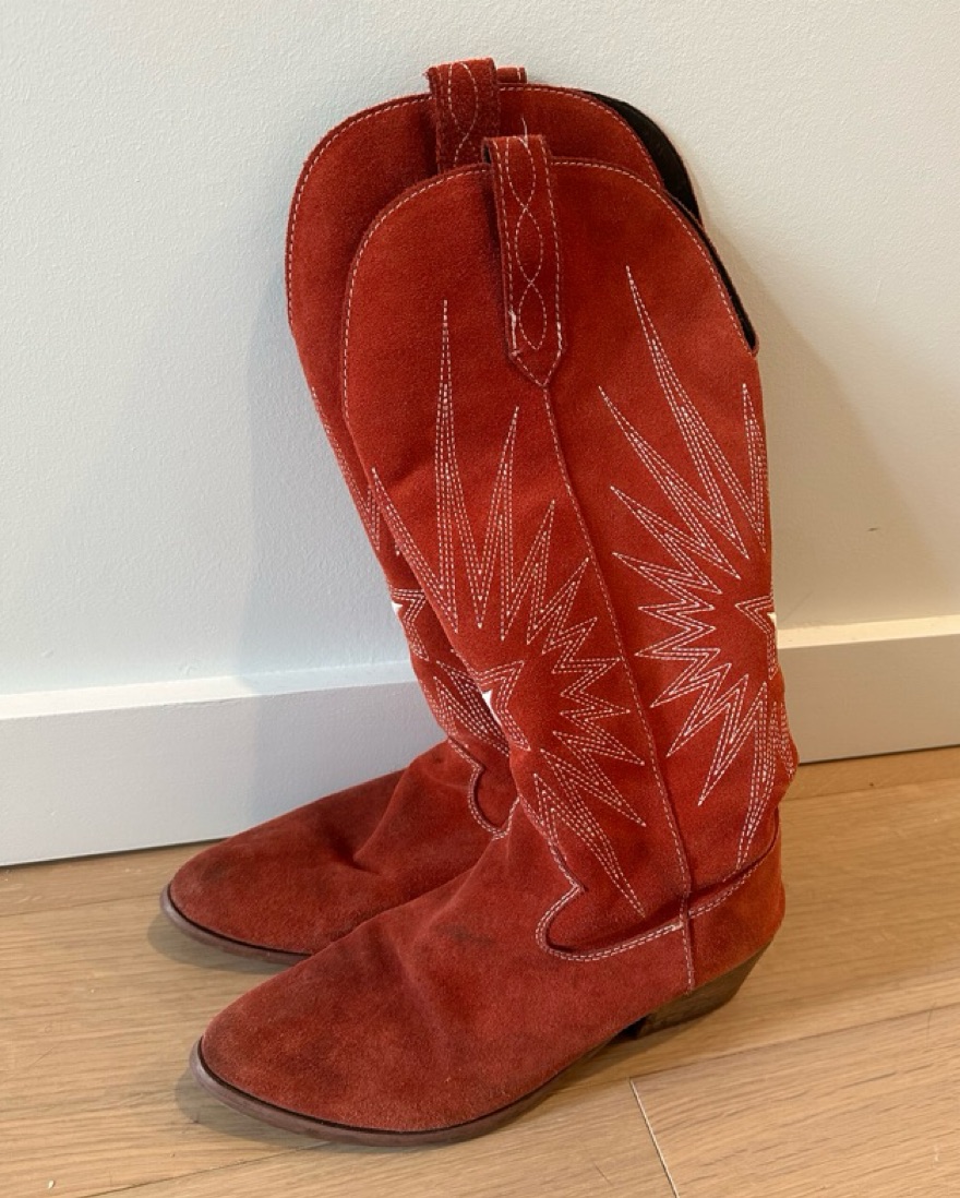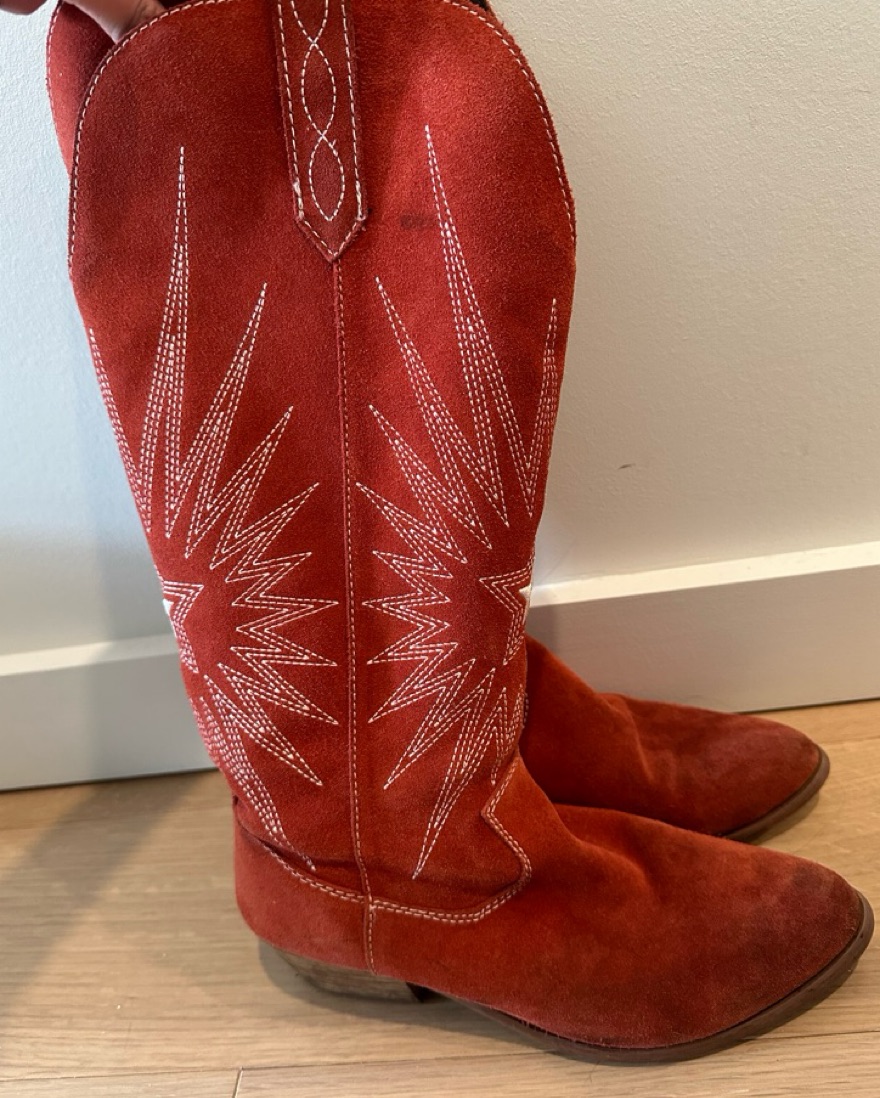 Red suede cowboy boots, size 8M! Purchased in Nashville and wear for special occasions or themed outfits, but also with long shorts and a top for a night out :) very on trend!