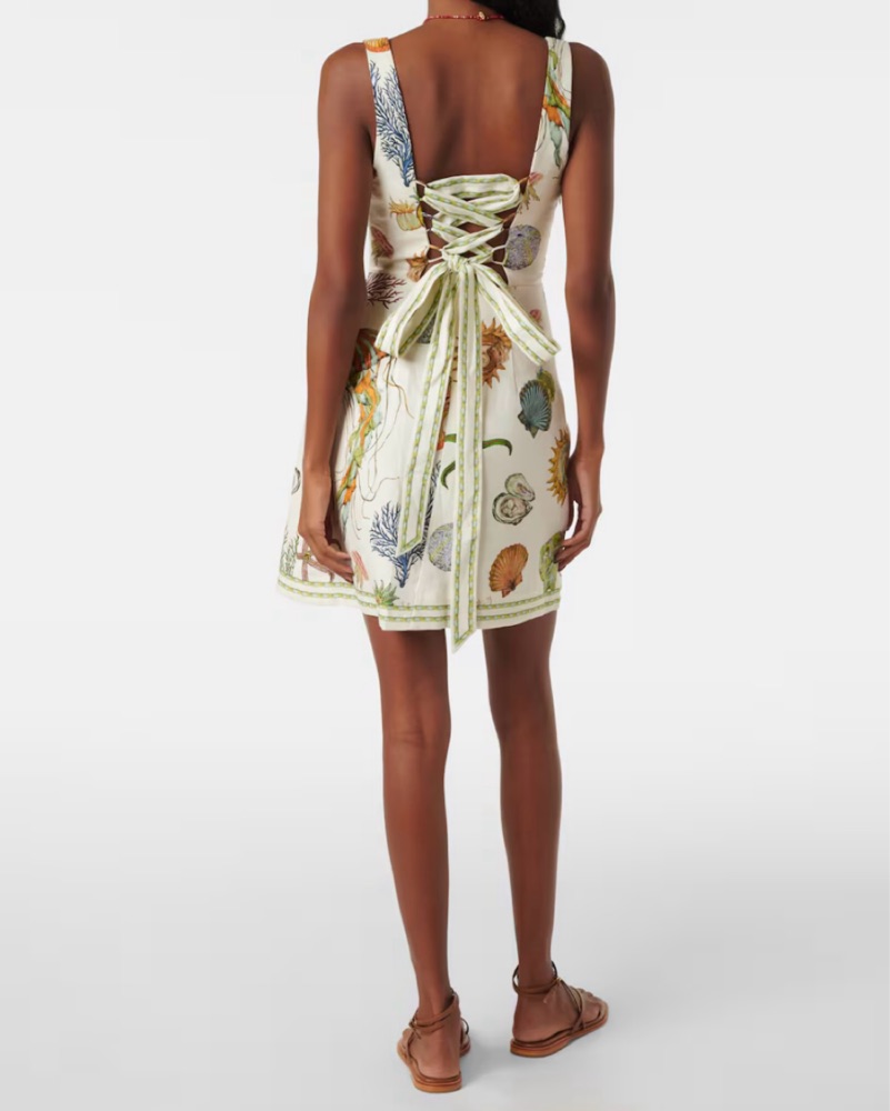 This charming mini dress features a vibrant seashell print, perfect for a beach vacation or summer party.