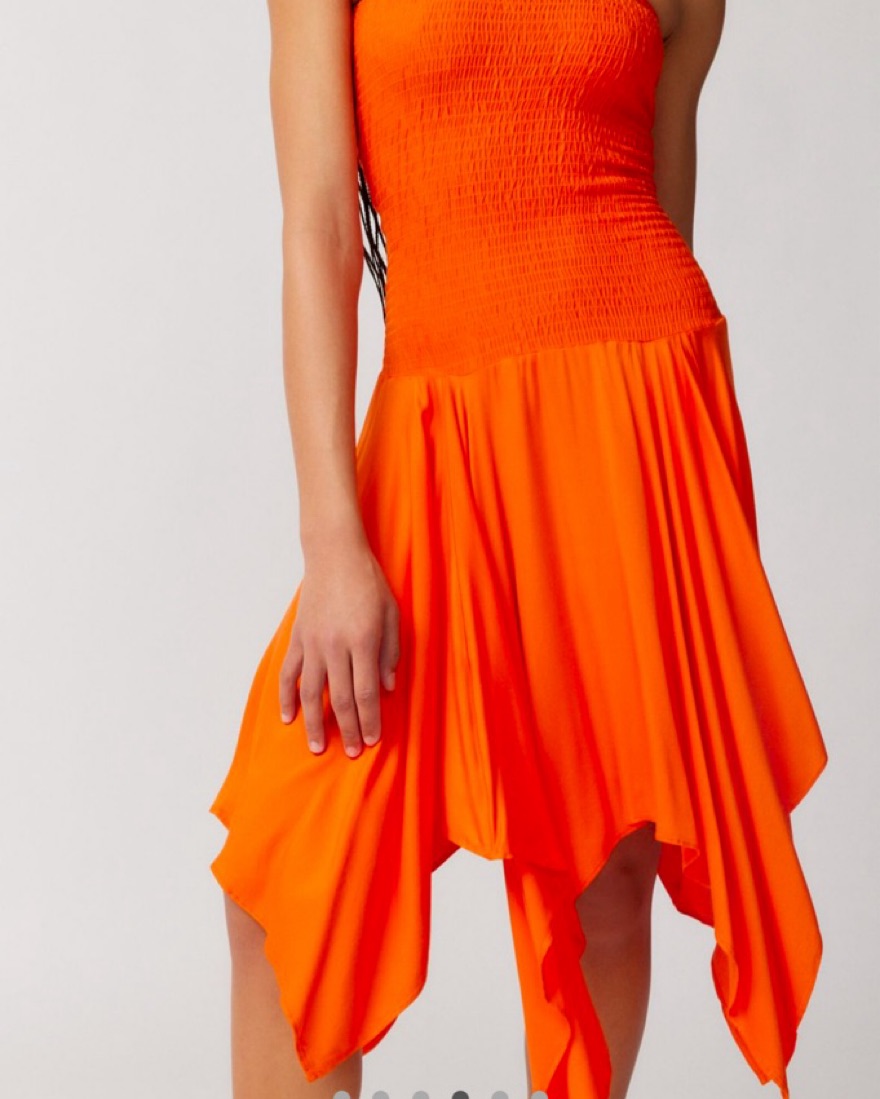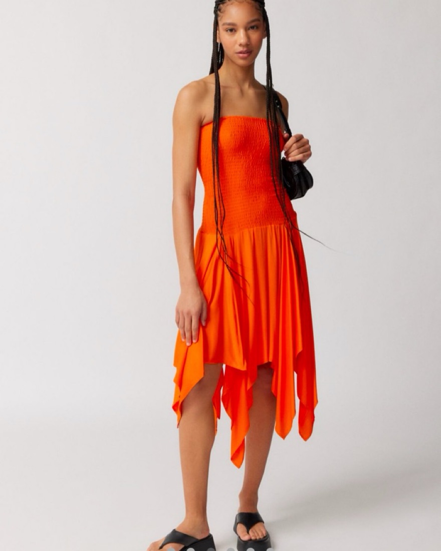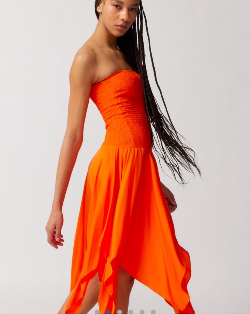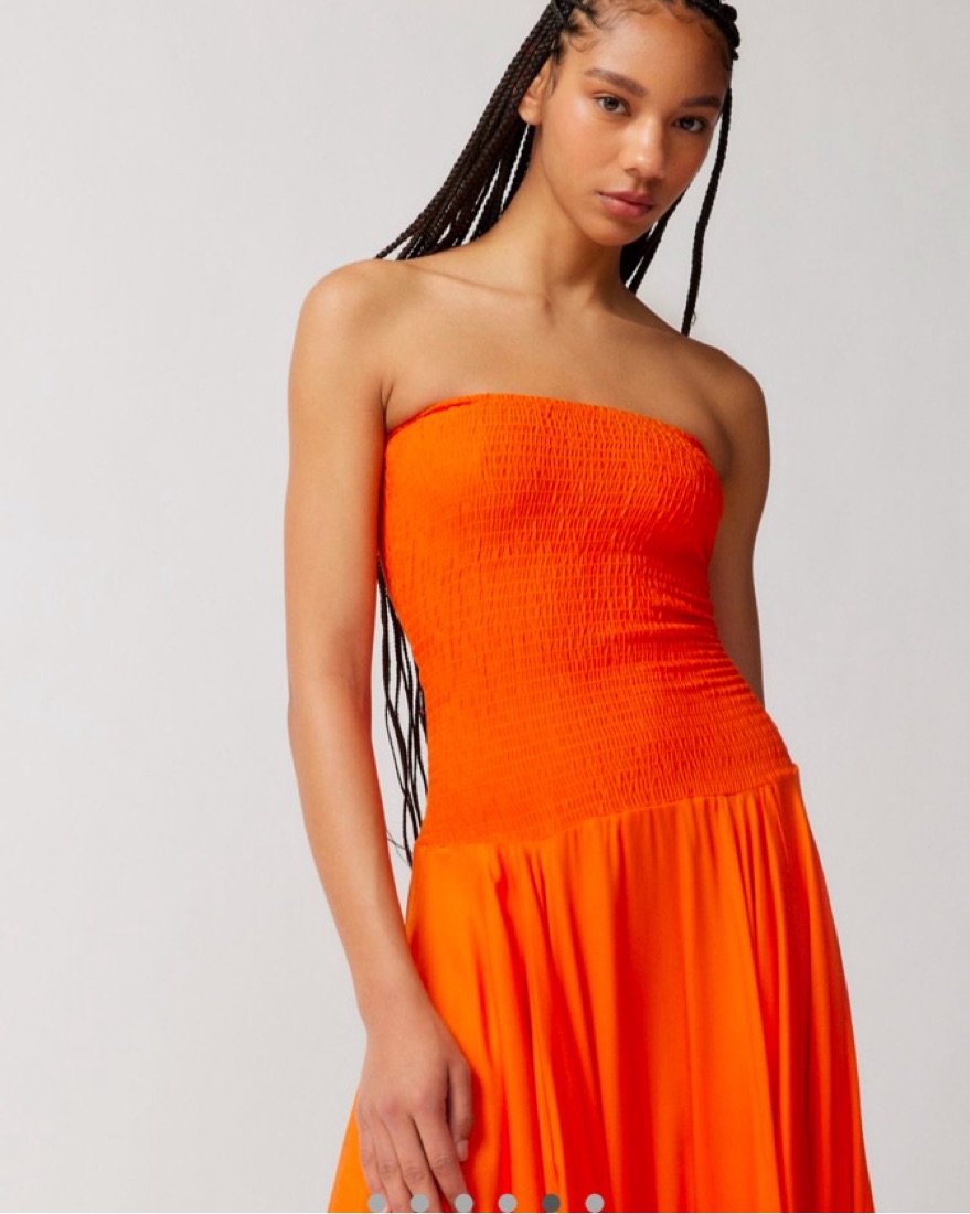 Midi dress from Ecote with a drop-waist silhouette. Cut with a strapless neckline and a smocked + fitted bodice. Complete with a swingy pointed hem.