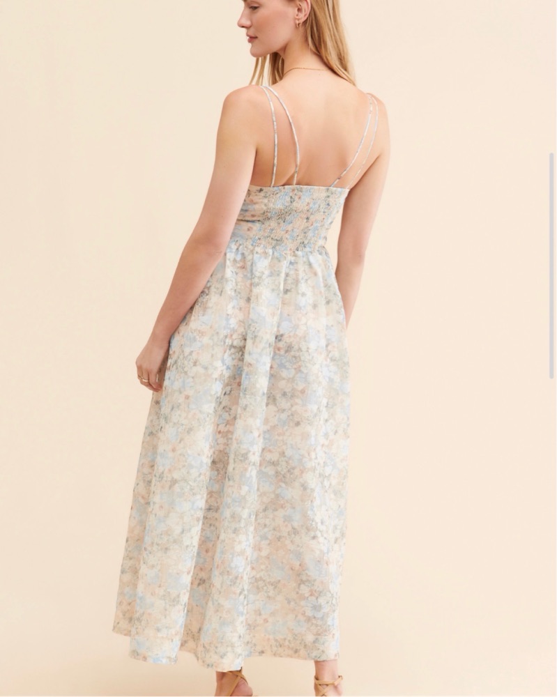 Flowy peach & blue floral midi with double tie-straps, and a flattering fit-and-flare silhouette. Perfect for a summer wedding guest, garden party, graduation, or engagement photos.