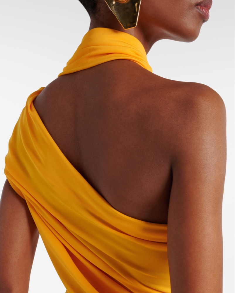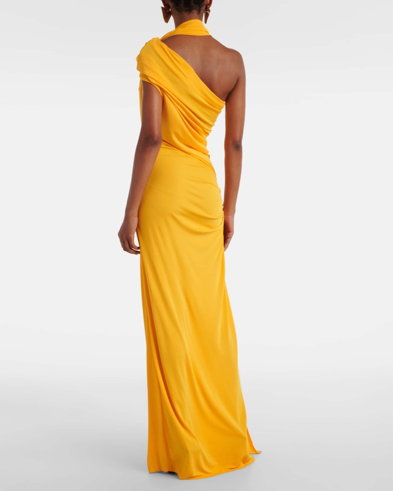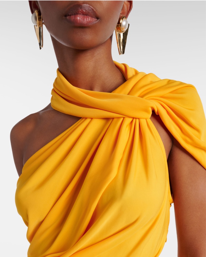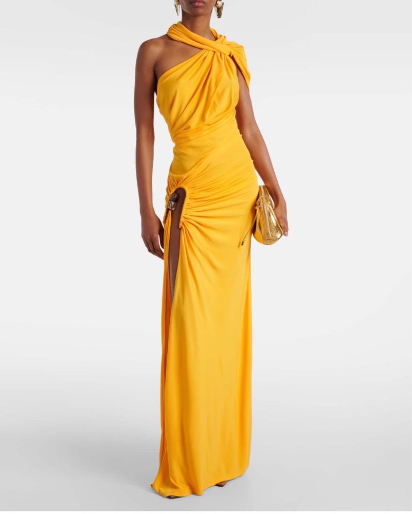 From the new collection. The Helix Crystal Asymmetric Gown in Yellow Citrus. Gorgeous fabric, fully lined, high slit leg detail. Very sculptural and unique gown. Stunning in person! Size US 4 - fits like a size XS / Small. Has not been hemmed.