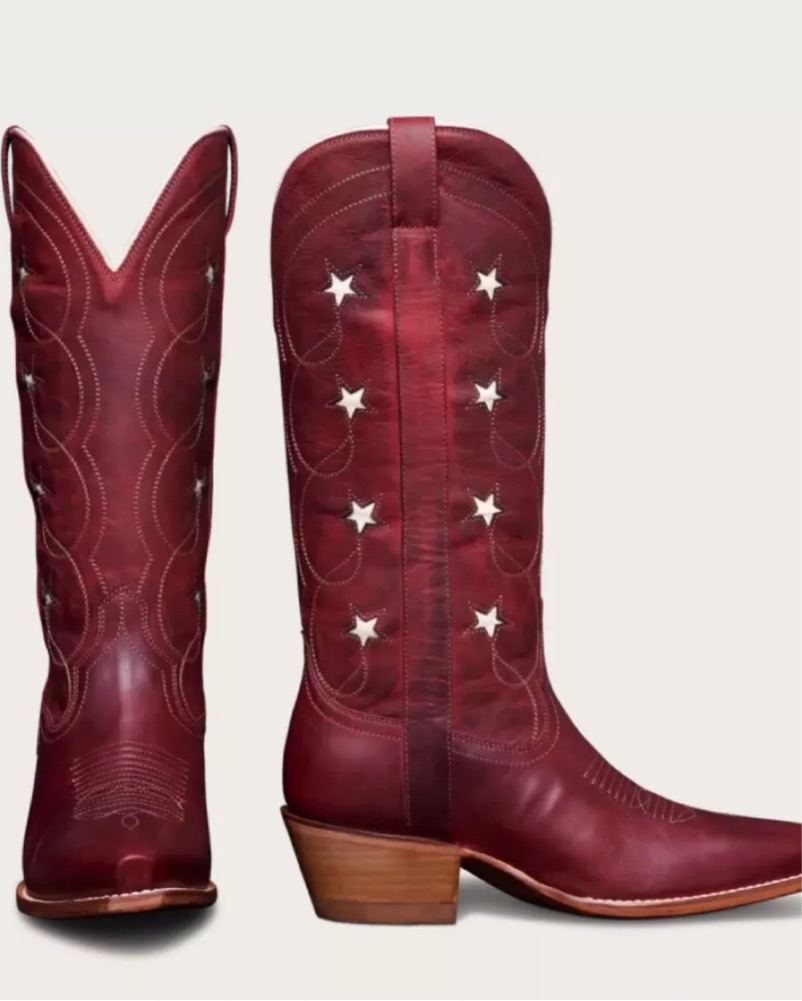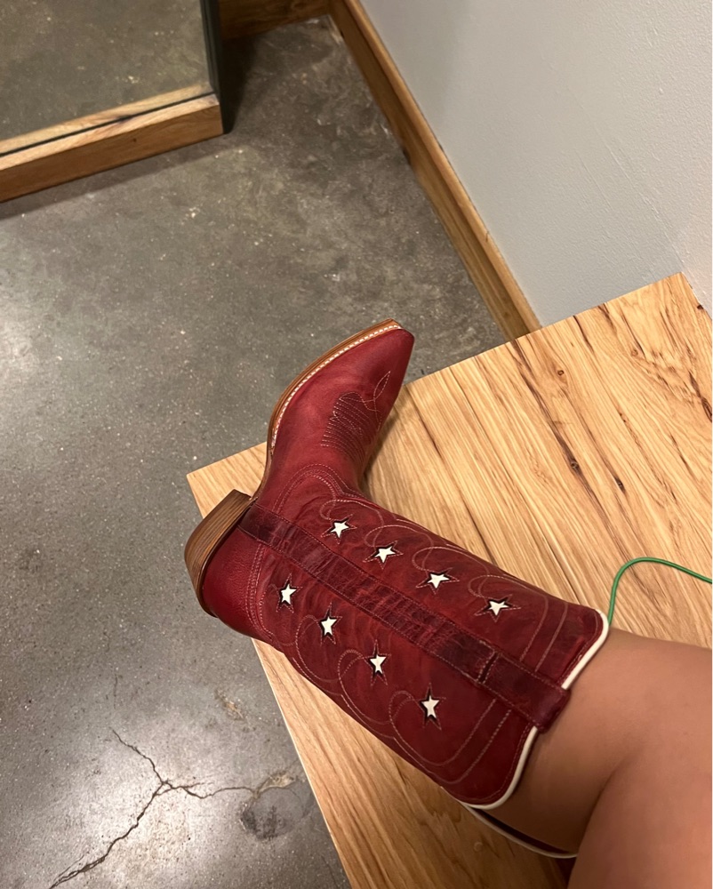 Limited edition, red goat skin boots with star details. Complete any outfit with these boots. Please take special care not to scuff or scratch these boots. Do not wear out on rainy days. Do not step in puddles or mud. Size 7. True to size. Hand off only.