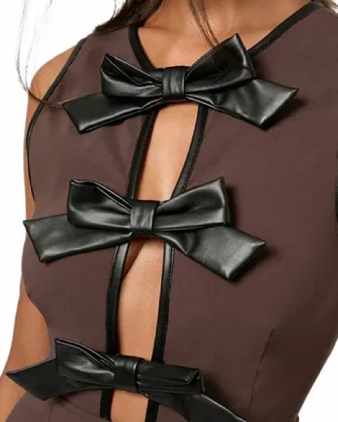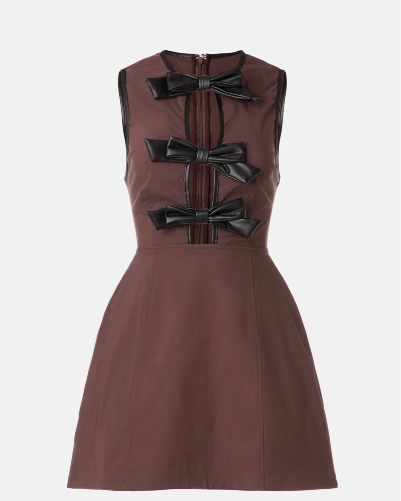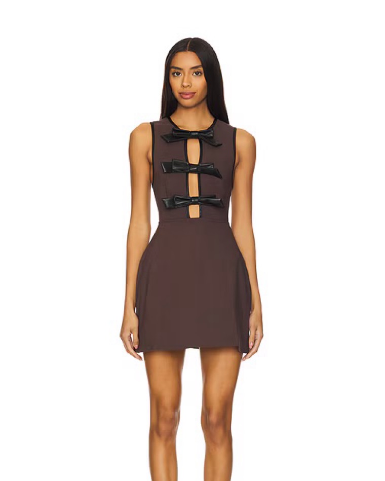 Brown mini dress from WeWoreWhat with black vegan leather bows! Very cute for fall. Never worn yet since I bought right before spring. Currently sold out through the website but expensive on revolve.