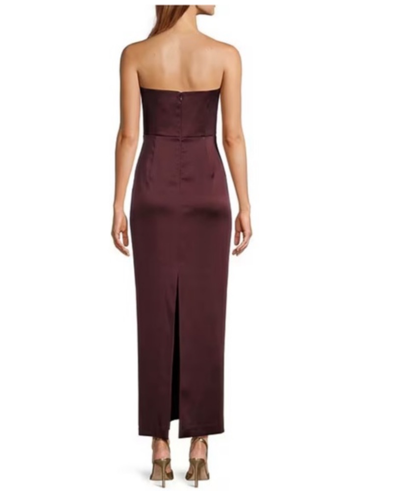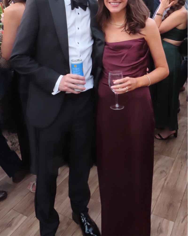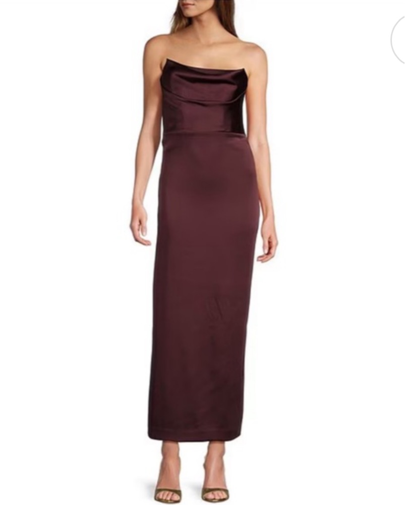 Maroon / "Wine" / dark plum red satin formal dress. Super flattering and the fabric isn't too thin.