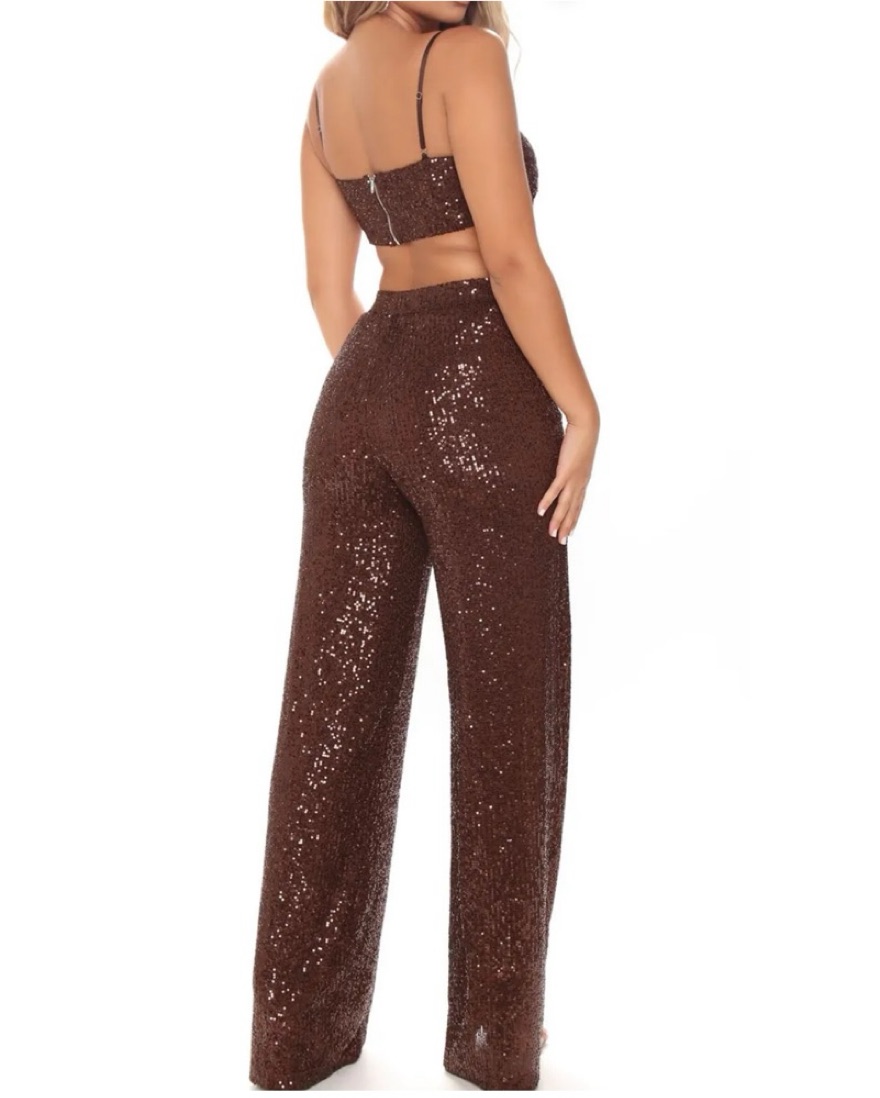 Brown Sequin Bra Top And Flare Pants by Fashion Nova - Pickle