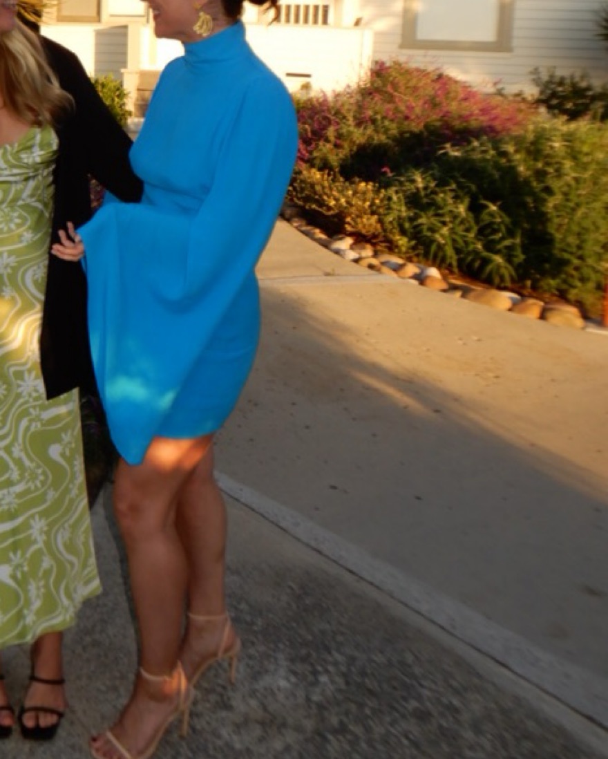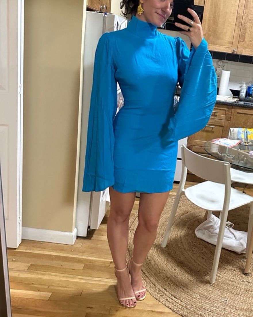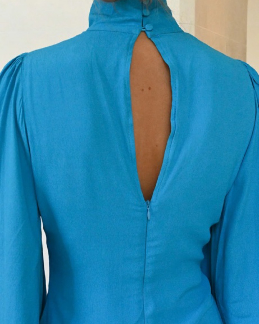The Raya Dress is an elegant mini dress featuring billowing bell sleeves and a flattering mock neck. Finished with a back slit, an invisible zip closure, and buttoned neck.