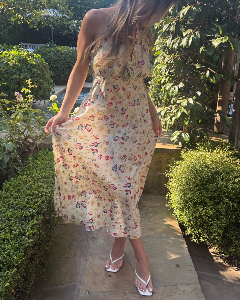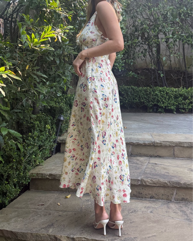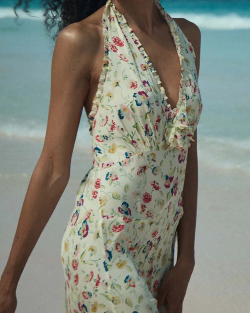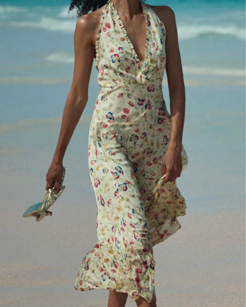 In silk-viscose twill graced with our ‘30s-inspired Windswept Blooms print, our Mazarin Dress returns, featuring a plunging halter neckline adorned with petite ruffles and finished with a removable rosette brooch. A fitted bodice with an invisible side zipper gives way to an ankle-grazing bias-cut s