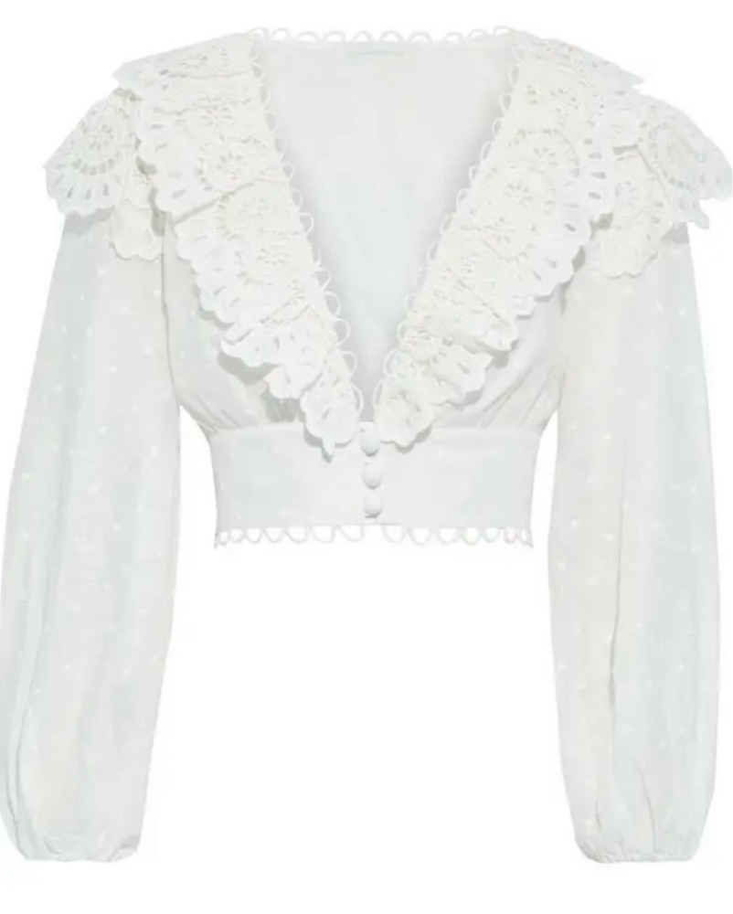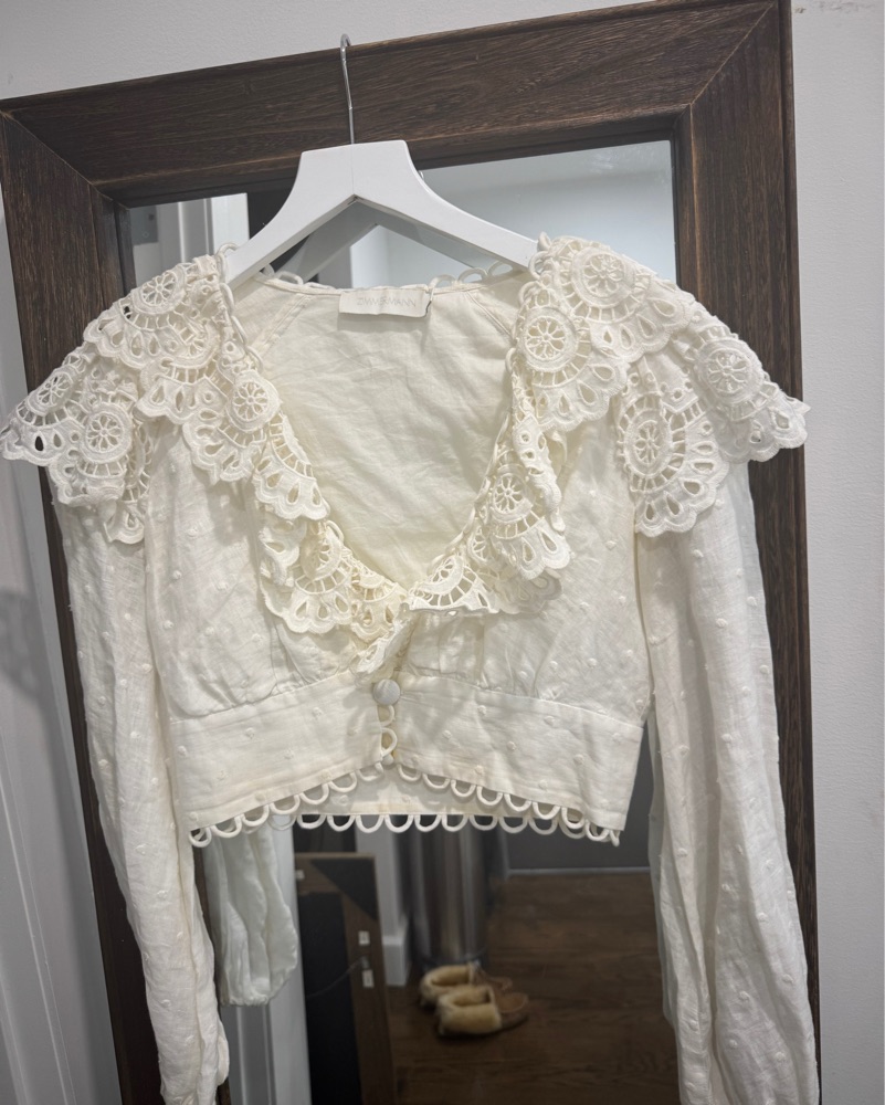 Beautiful top from Zimmermann with embroidered detailing and swiss dot fabric. Size 1. Missing 1 button and one repaired but not noticeable on and easily fixable.