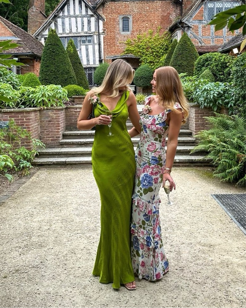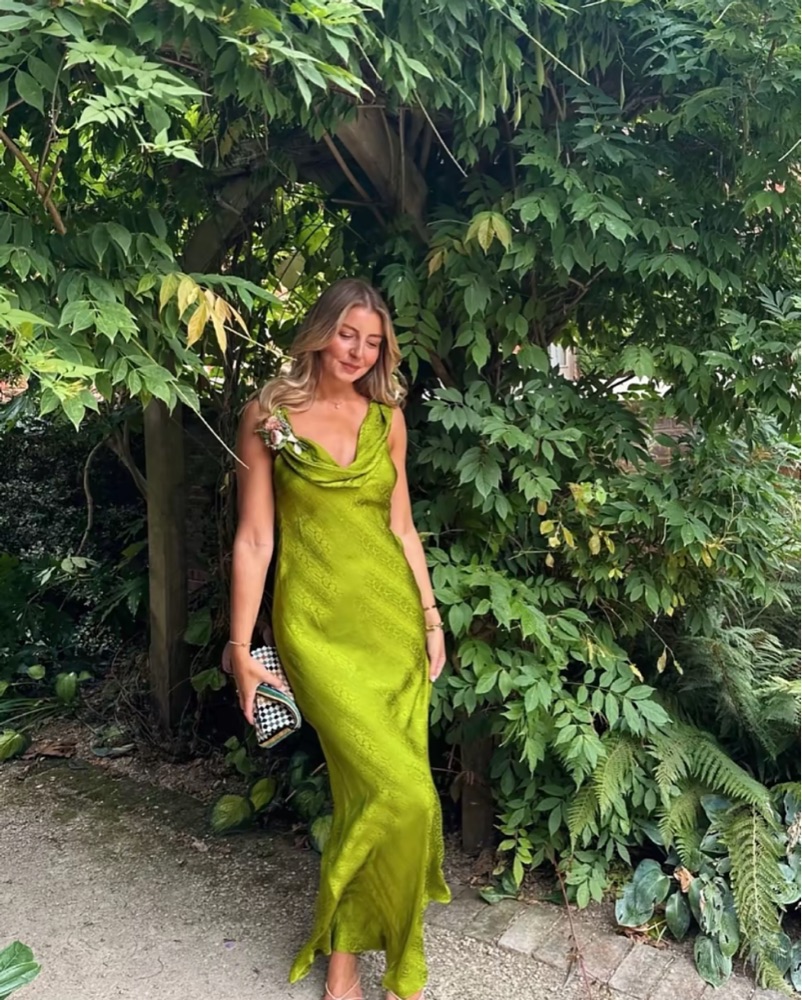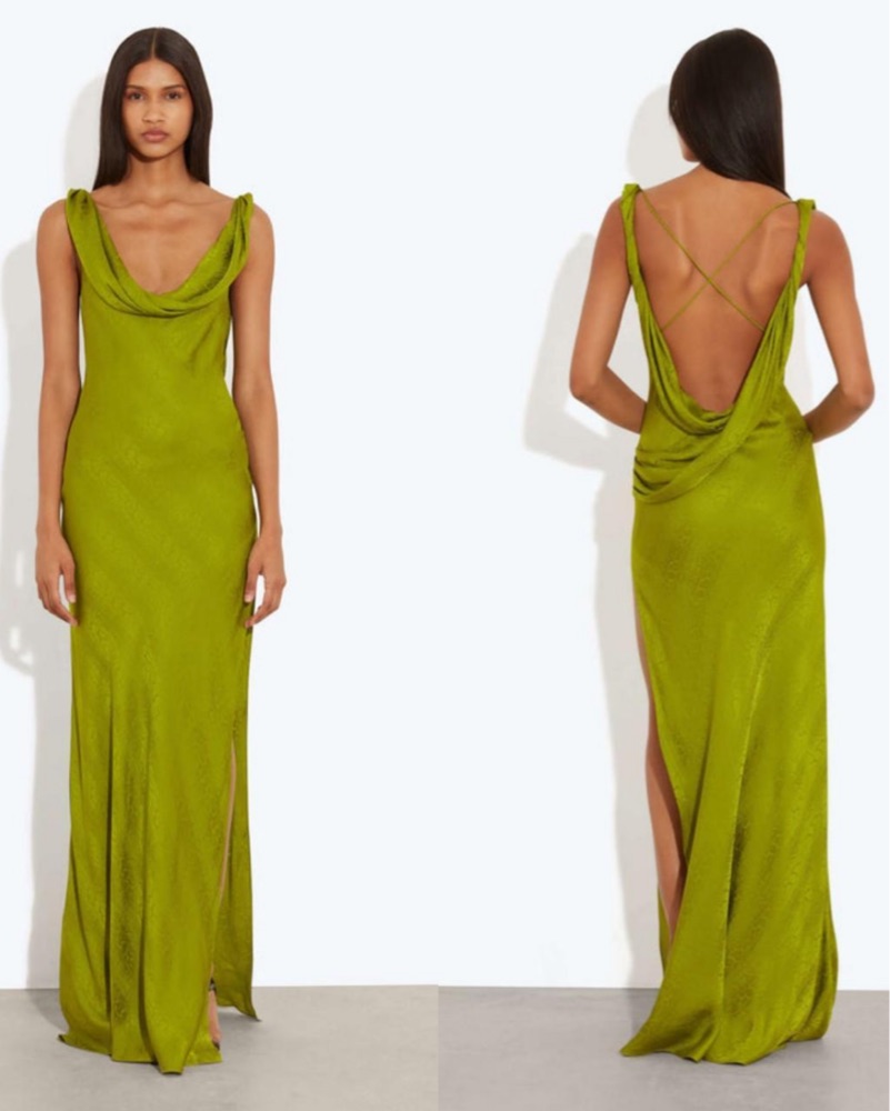 Beautiful low back maxi dress in green. Cow neckline and cross cross back straps. Perfect for spring and summer weddings, black tie, garden weddings, etc. 100% silk so please be careful!