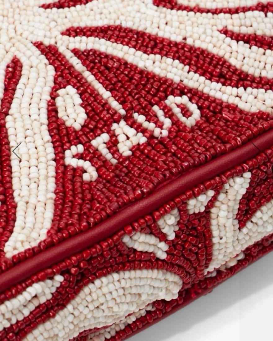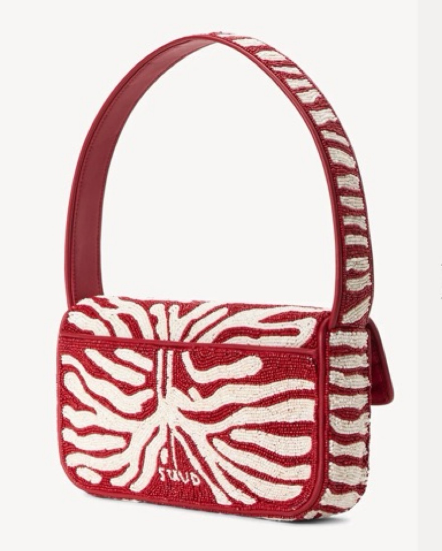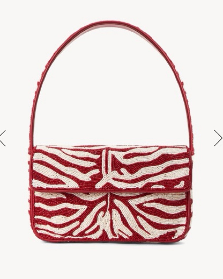 Staud beaded red zebra print bag! The Tommy is a hand-beaded shoulder bag with vegan leather piping. This style features a single flap closure, inner zip pouch and magnetic pocket on the back.