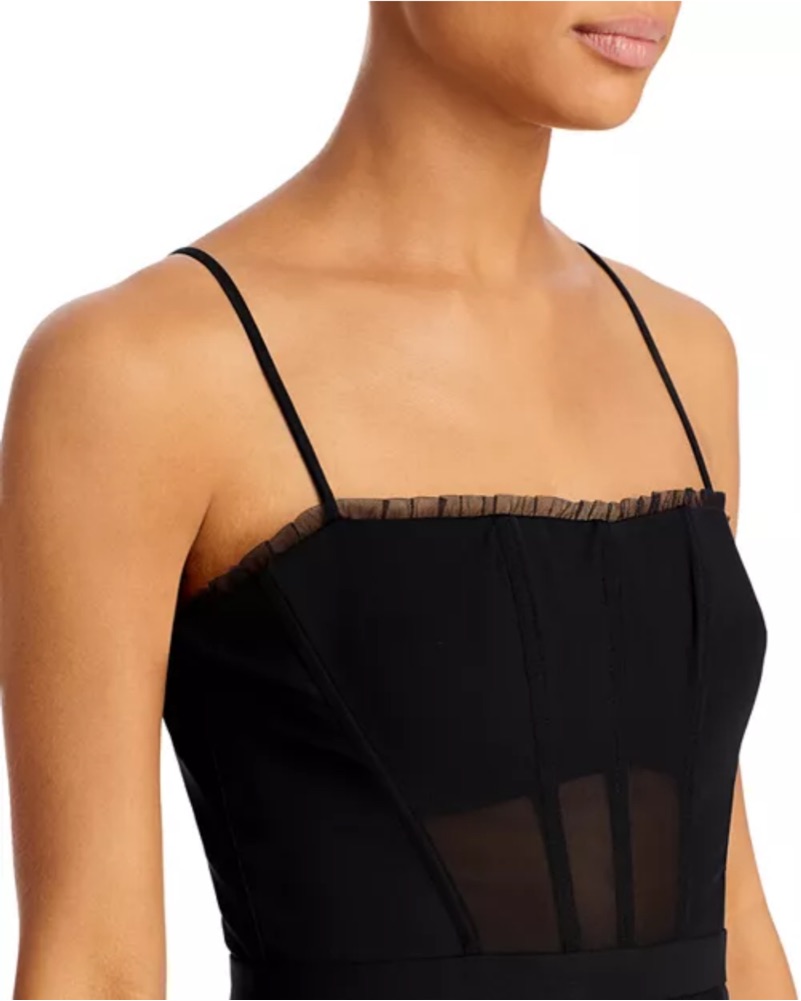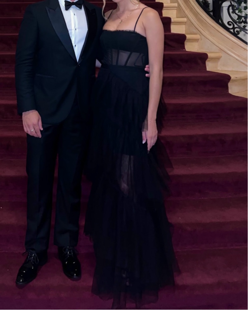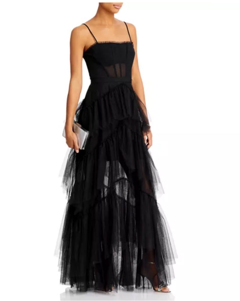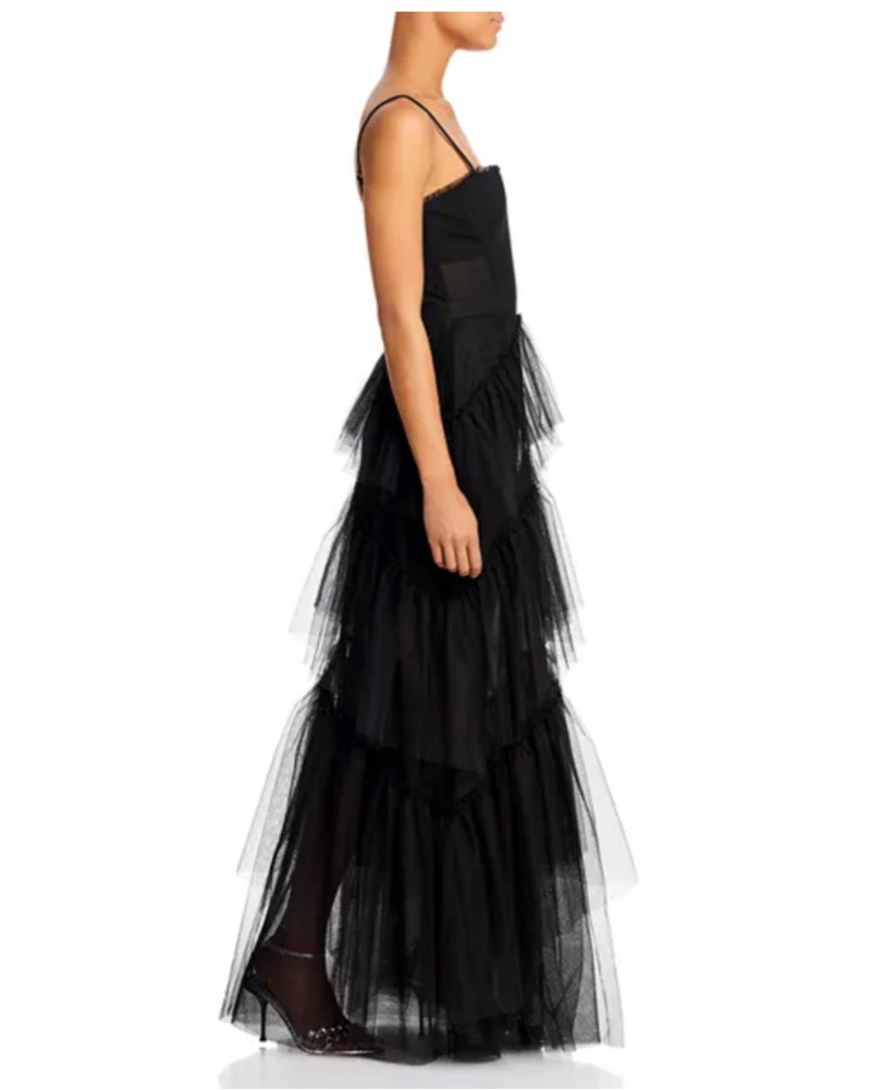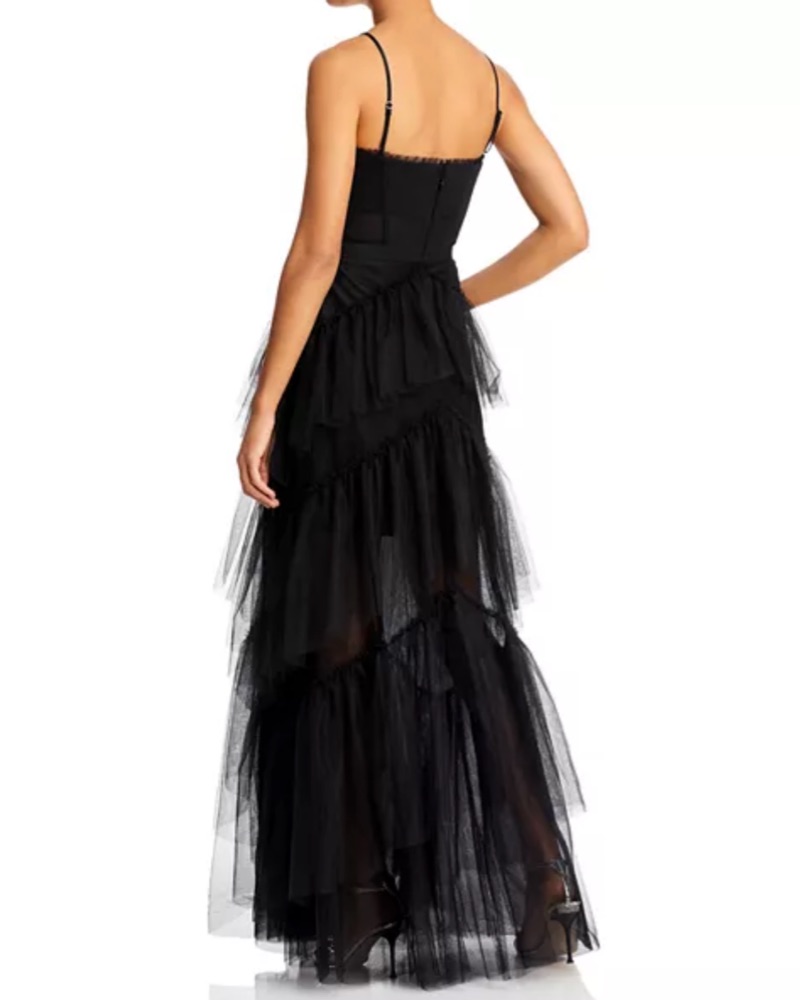 This striking black tulle gown is perfect for a formal occasion, such as a black-tie event or special party. The cascading ruffles and sheer panels add a touch of drama and sophistication.