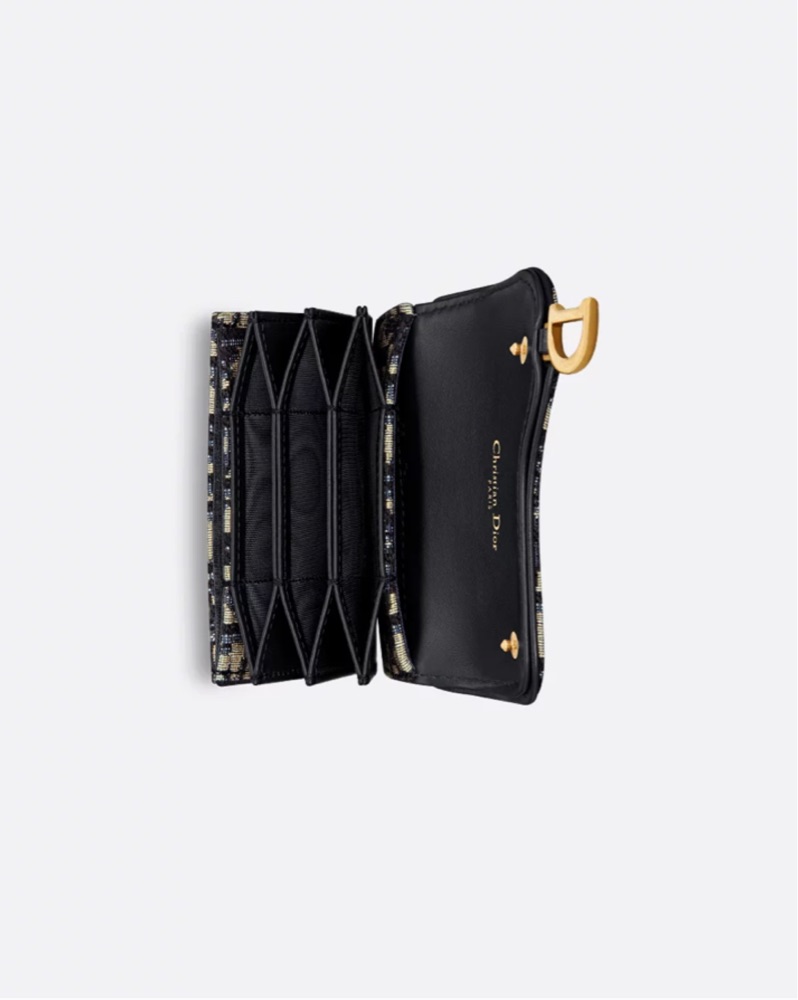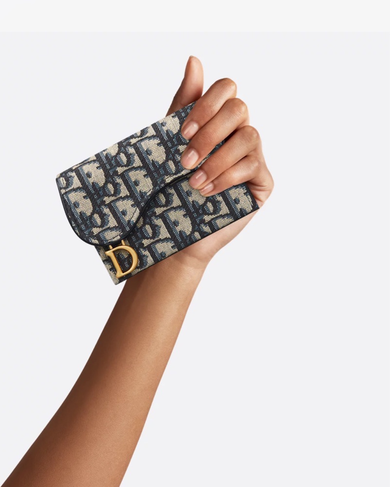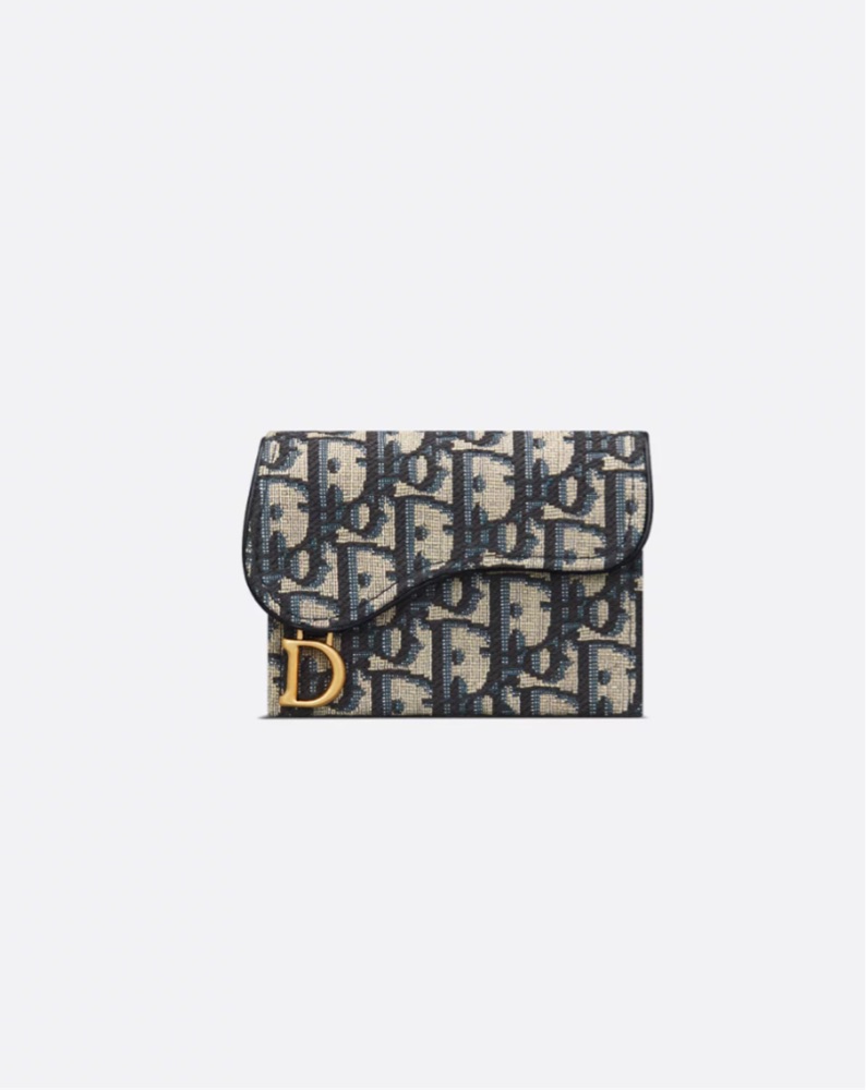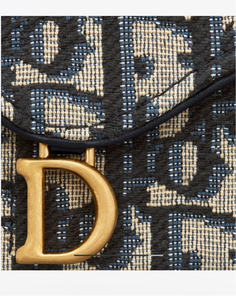 The Saddle Jasmine gusset card holder showcases Dior's craftsmanship with its blue Dior Oblique jacquard design. It features an asymmetrical flap with a snap closure, a metal D stirrup and five gusset compartments. Dimensions: 11.5 x 8 x 3.5 cm / 4.5 x 3 x 1.5 inches