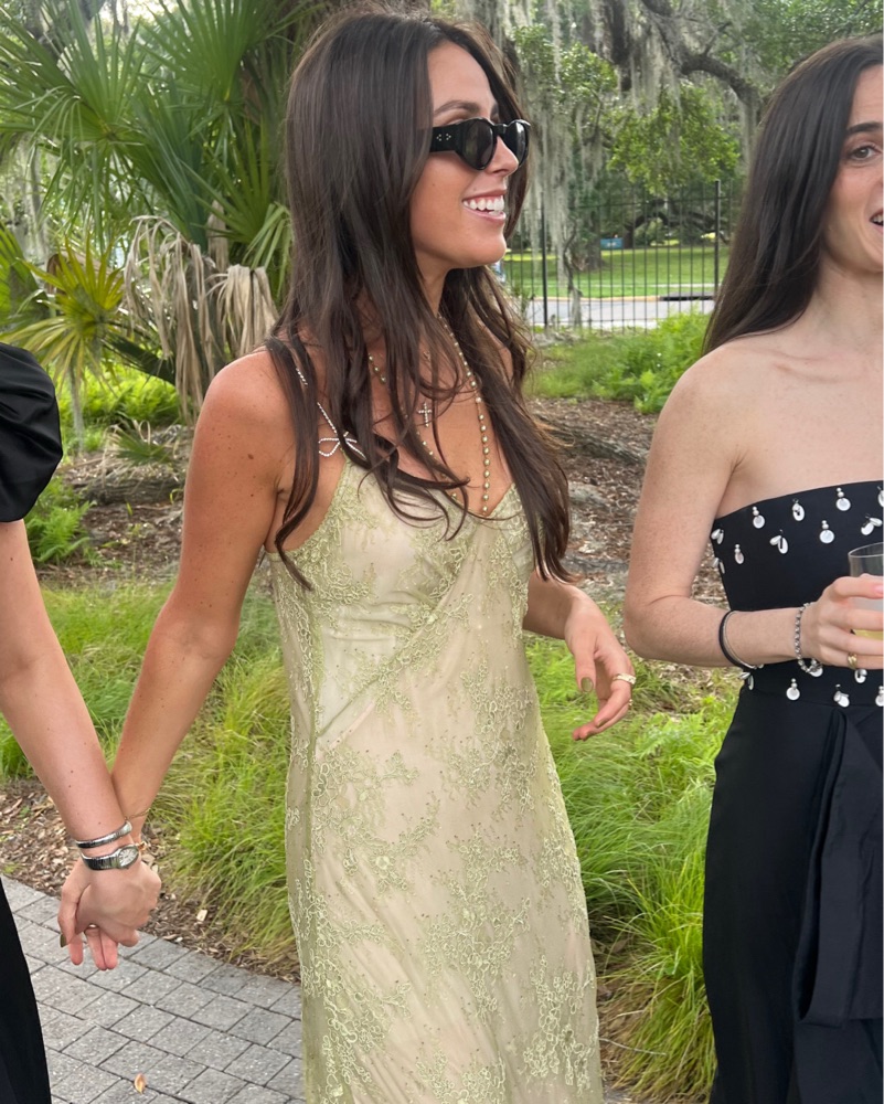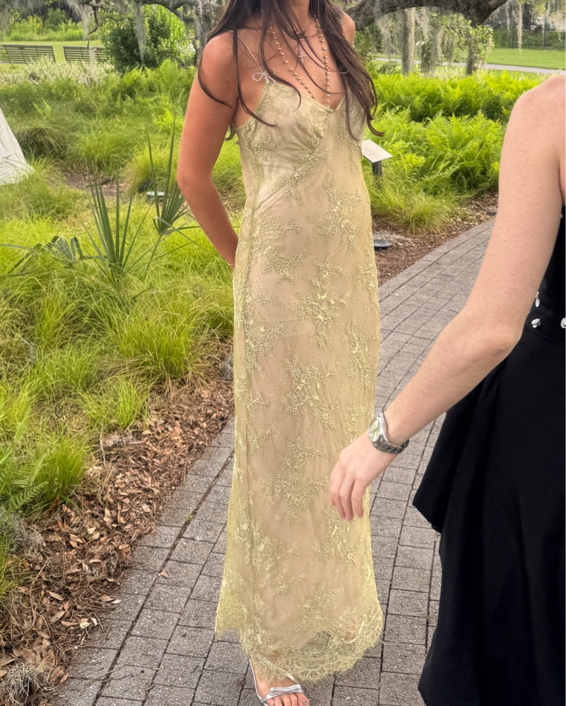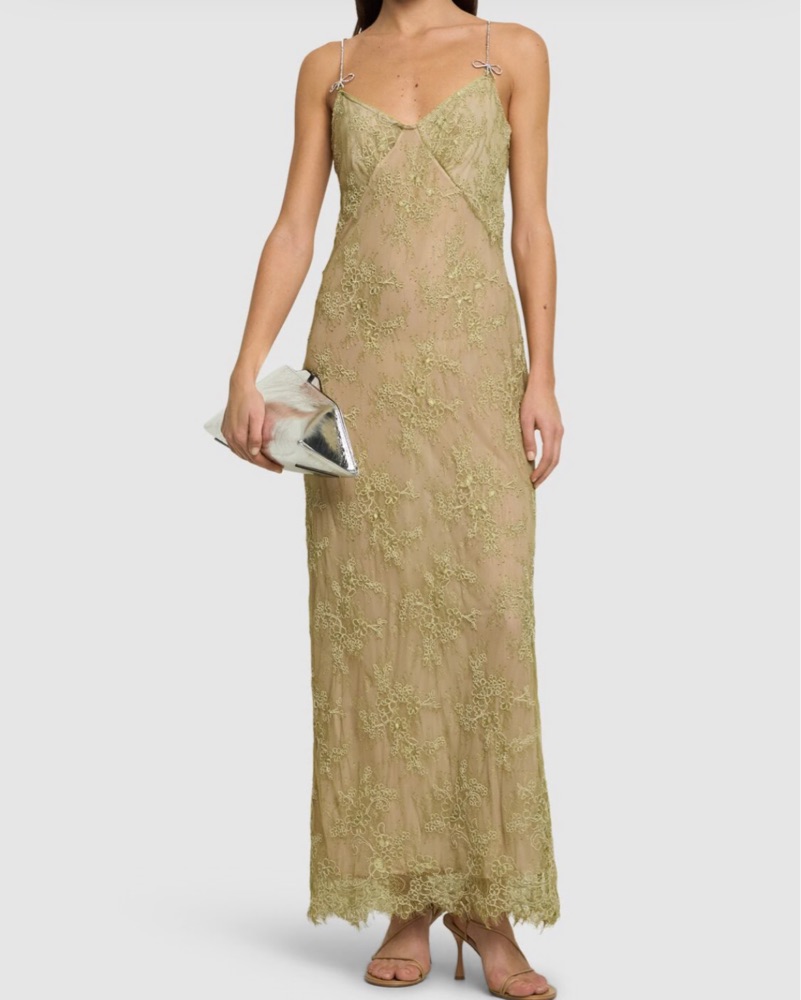 Blumarine Rebrodé lace slip dress. Gorgeous light green lace pattern & intricate studded spaghetti straps. I got so many compliments on this dress-so flattering & unique.