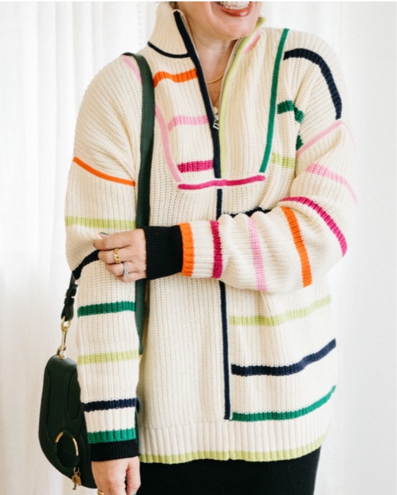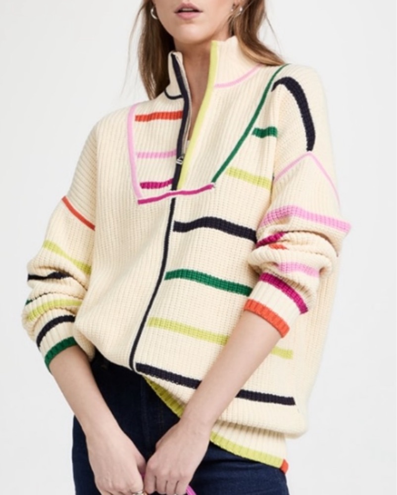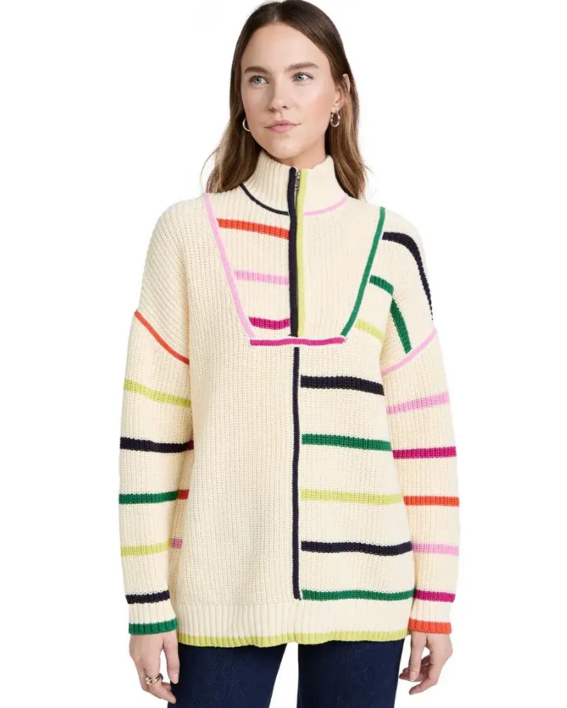 The STAUD Hampton Sweater is a heavyweight, loose, ribbed knit featuring a turtleneck and partial zip placket. This drop shoulder sweater has long sleeves and a colorblocked stripe pattern.