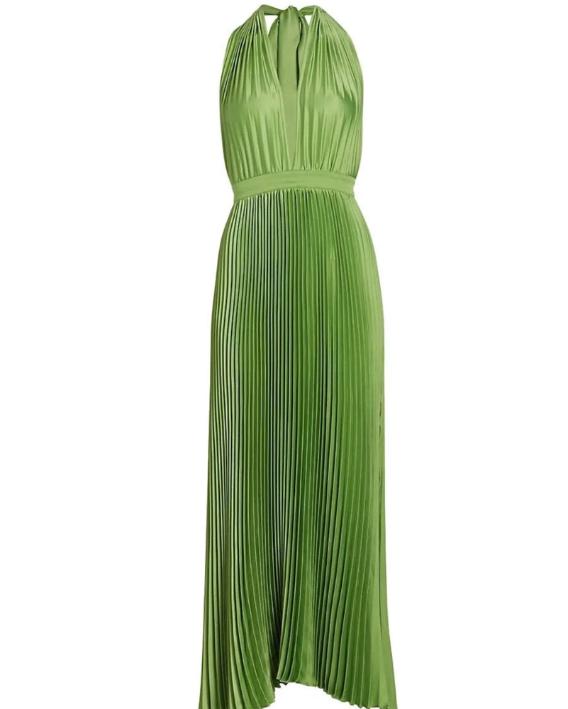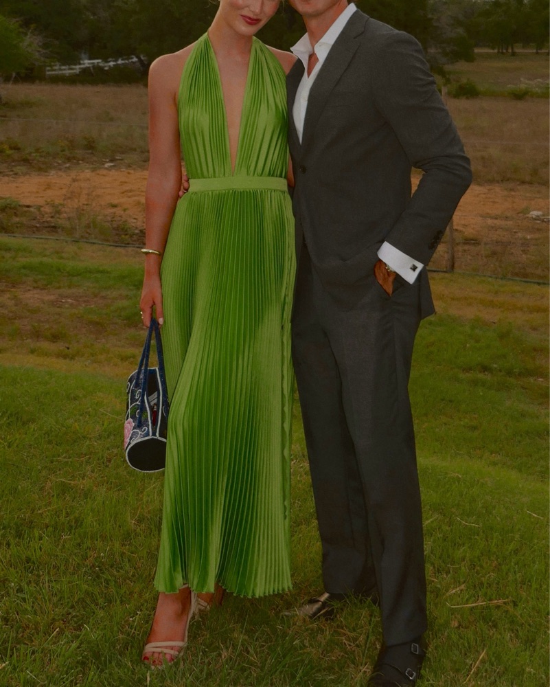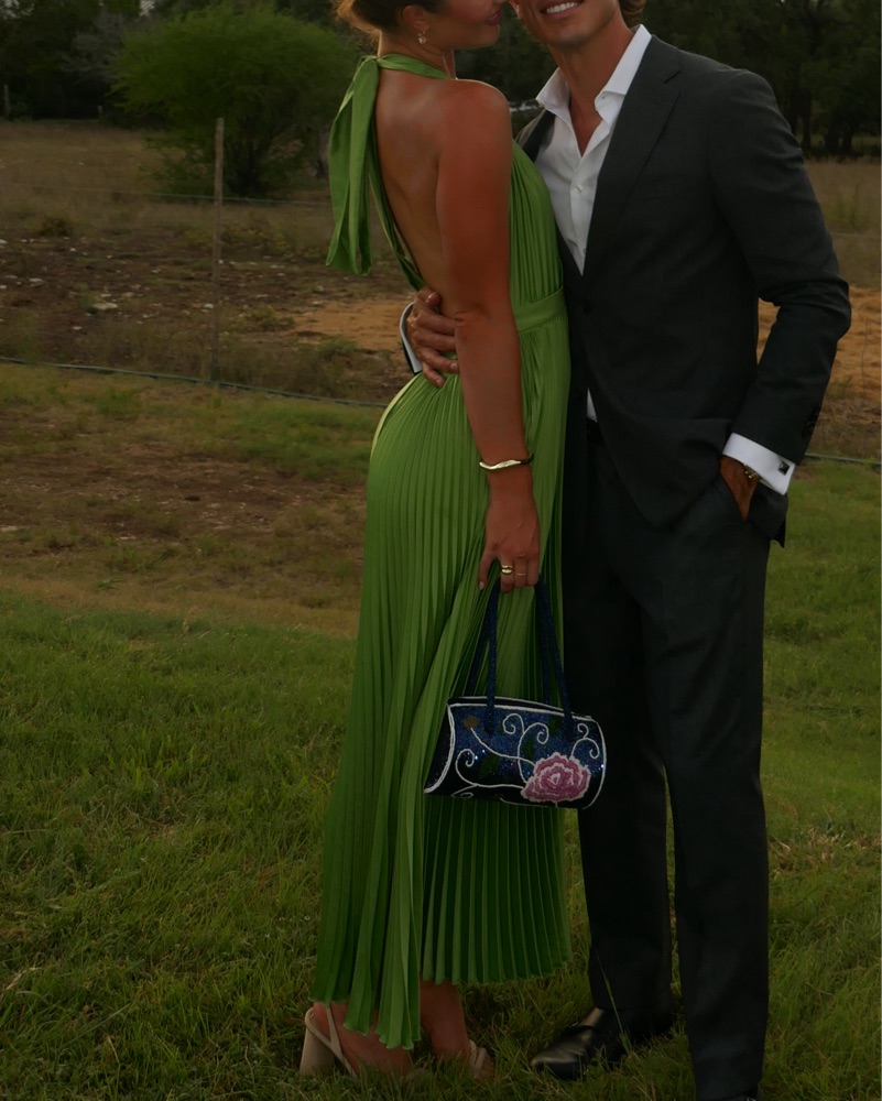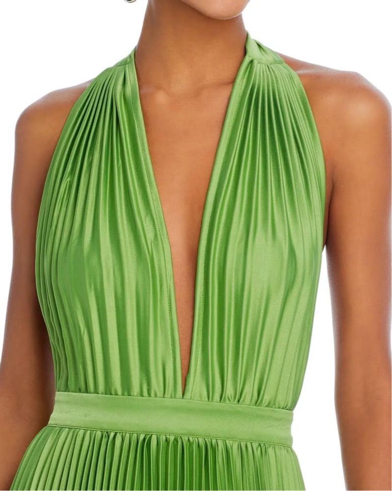 Green L’IDEE dress. Perfect for any wedding guest look! This fits anyone medium or small because of the adjustable neckline. Sold out online!