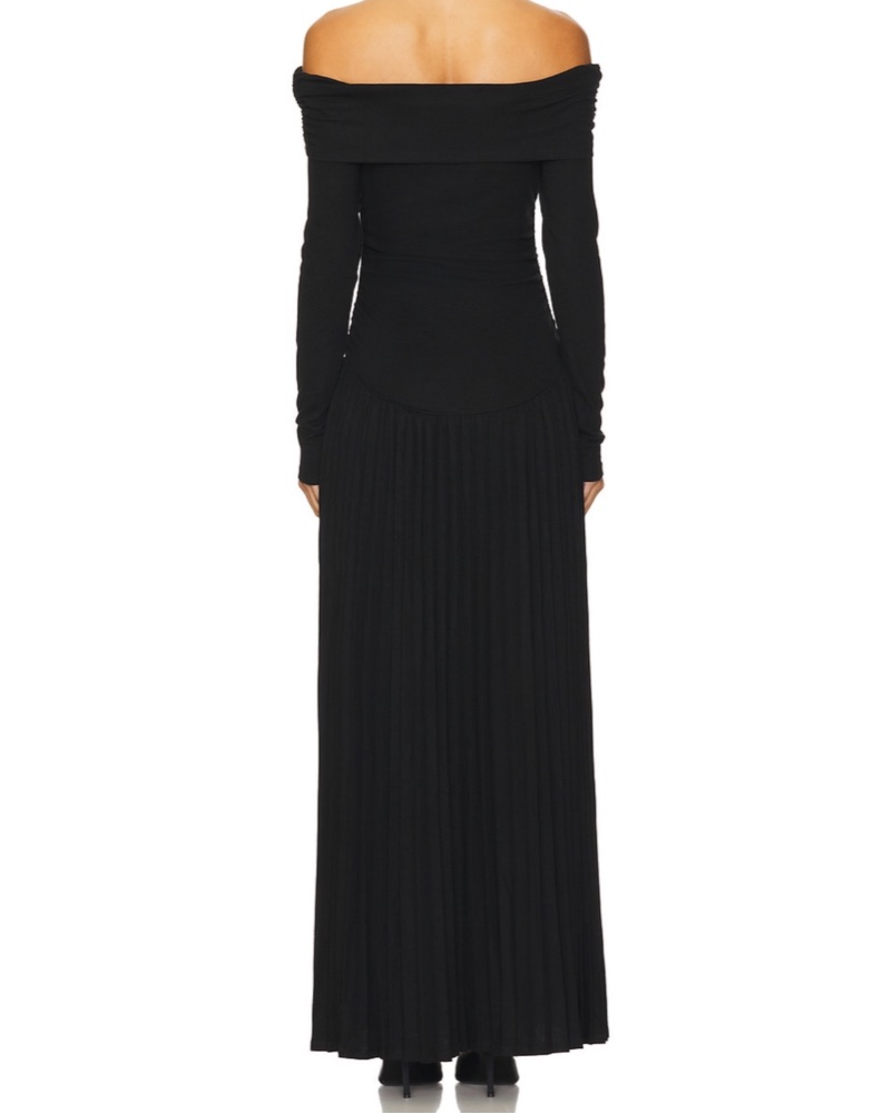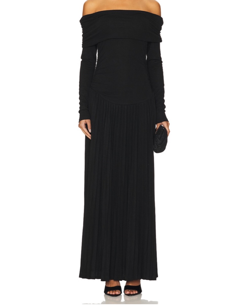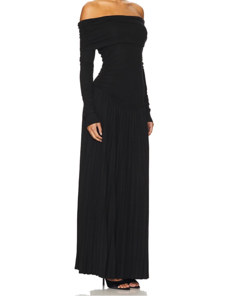 black maxi dress is perfect for a formal event or a night out. The off-the-shoulder neckline and flowing pleated skirt create a sophisticated and chic look. Drop waist